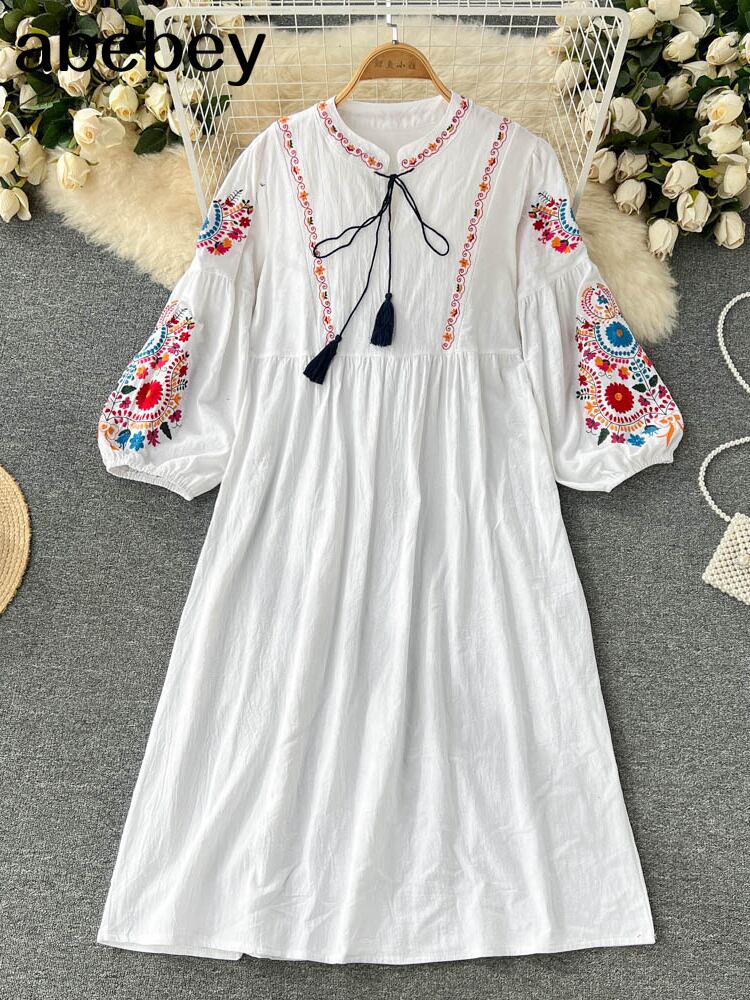 夏の白い自由奔放に生きるヴィンテージスタイルの手刺繍チュニックメキシカンドレスヒッピープエブラレトロヒッピールースVestidos ホワイト レッド サマー 夏物 ビンテージ Abe15220171817