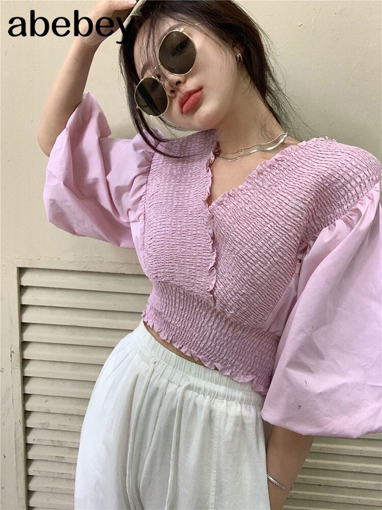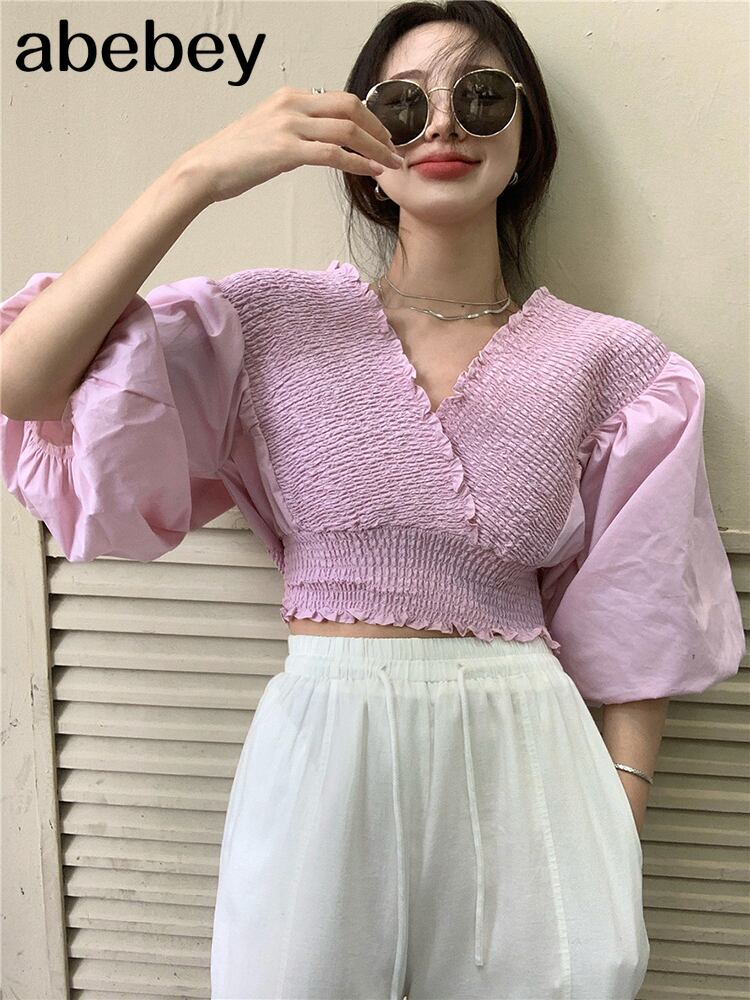 パッチワークシャツVネックパフスリーブソリッドスリムショートブラウス女性2022春スタイル スプリング 春物 ソリッドカラー Abe90752900733