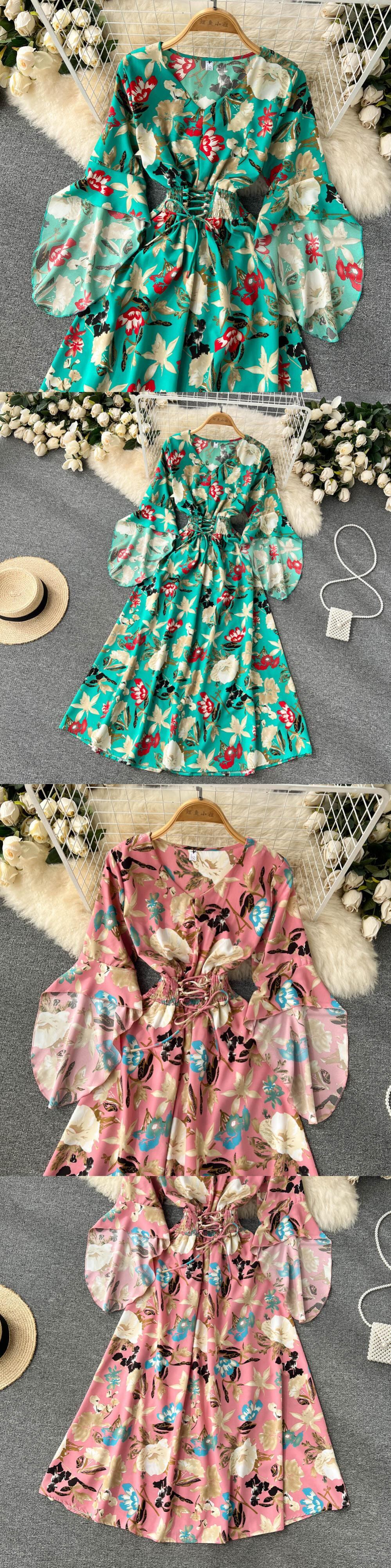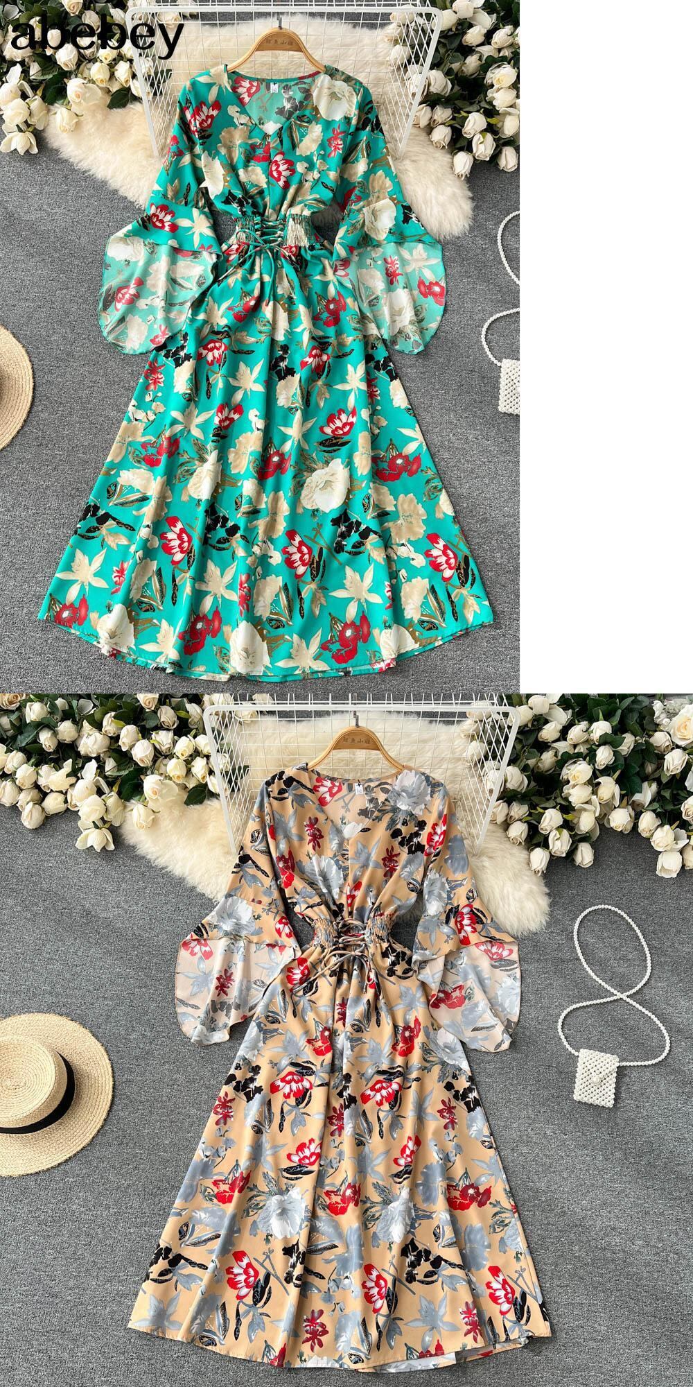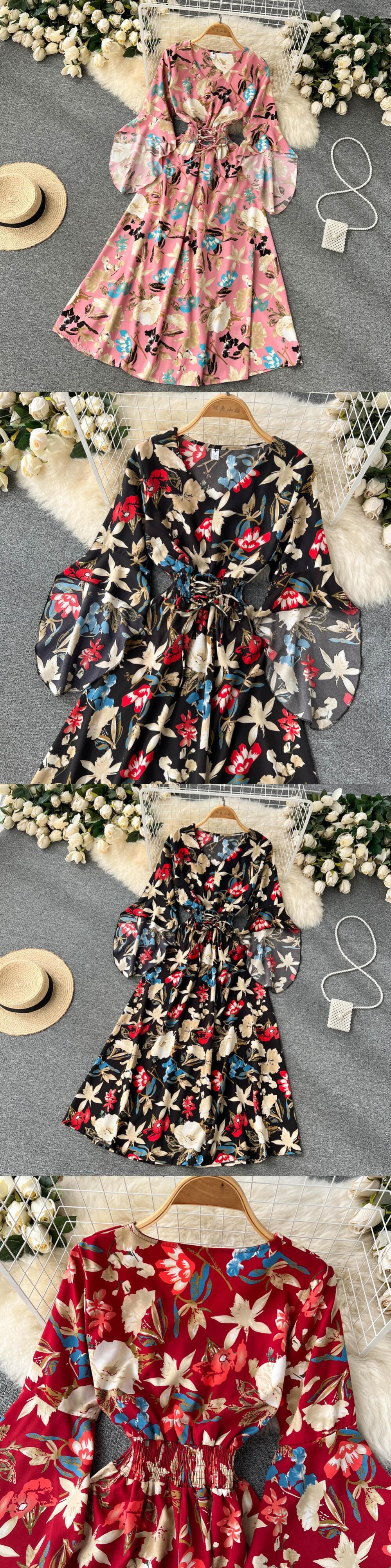 レディースブラックフローラルプリントミディパーティードレス2022サマー半袖Vネックドレスシフォン ショート ハーフスリーブ 夏物 花柄 Abe36211927662