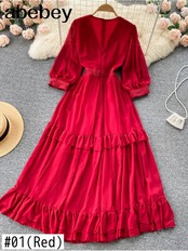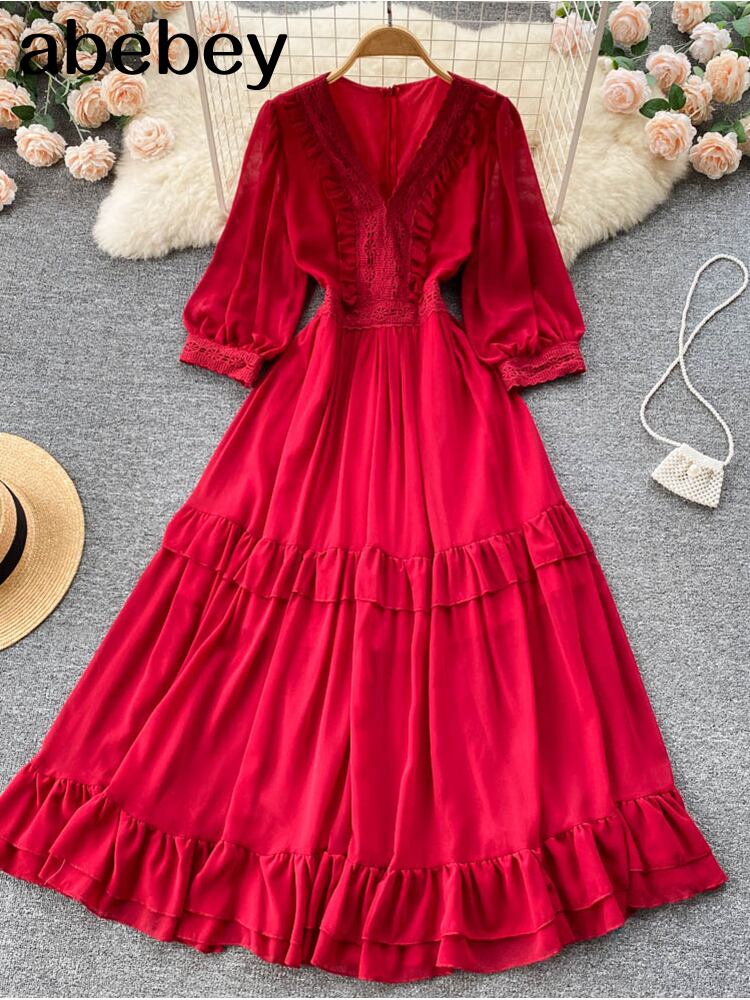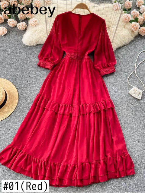 女性ロングドレス自由奔放に生きるサマービーチ赤いドレスレイドマキシVネックサンドレスヴィンテージセクシーローブロング2022 レッド 夏物 ビンテージ Abe34129753783