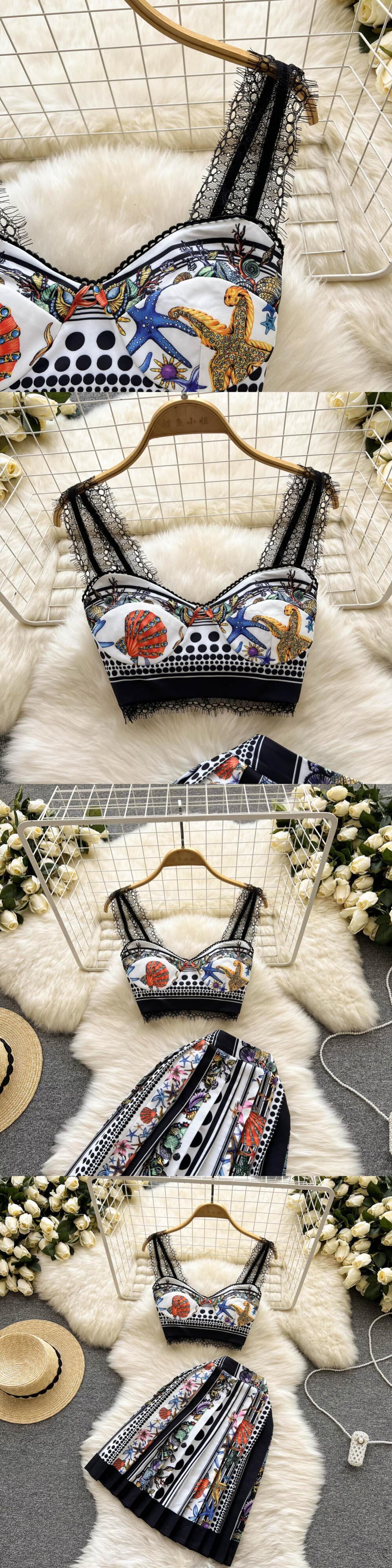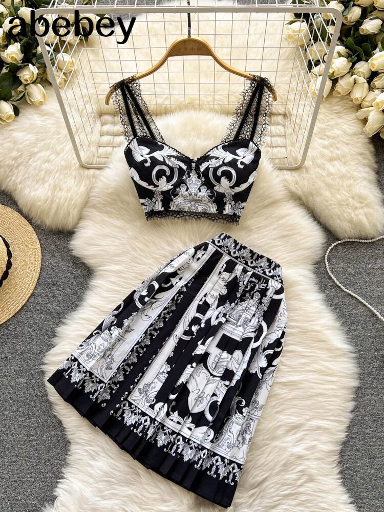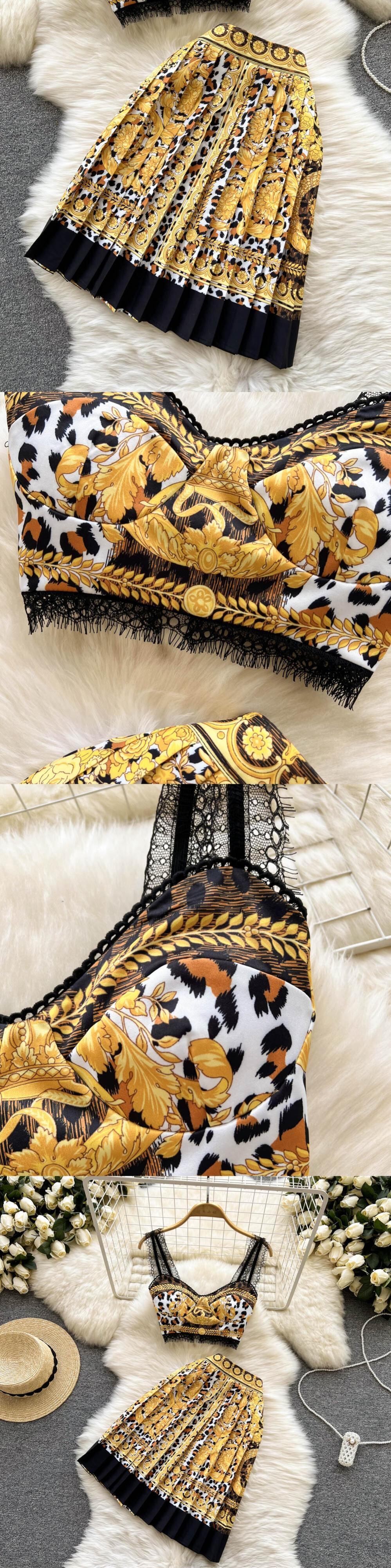 2022ウィメンズパレスレトロプリントノースリーブキャミTOP+ウエストスカートツーピースセット レース Abe56663550824