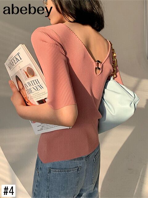 2022VネックサマーウィメンズTシャツスタイルスリムニットTシャツトップス無地半袖セクシーTシャツ ショート ハーフスリーブ 夏物 ソリッドカラー Abe95555035220