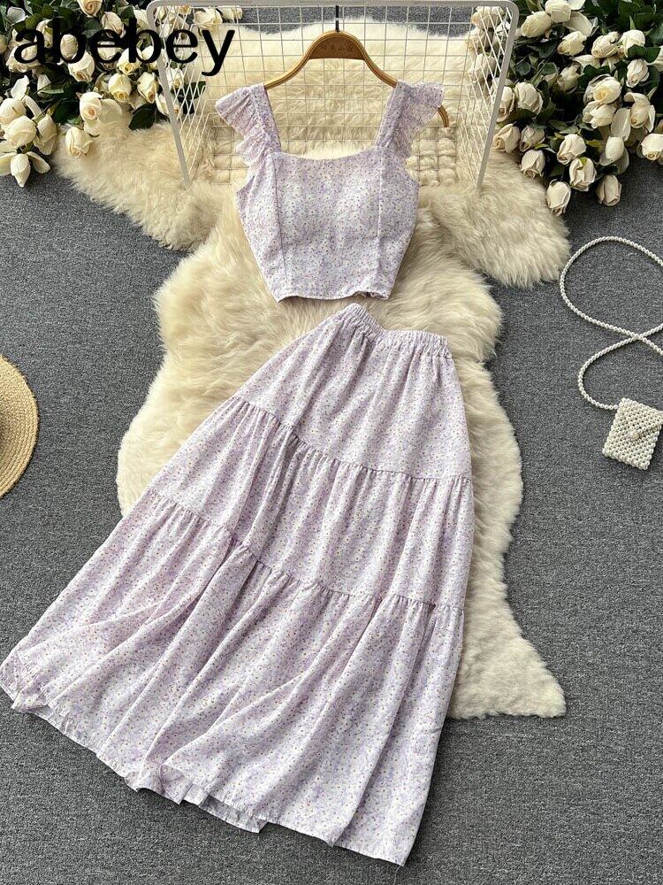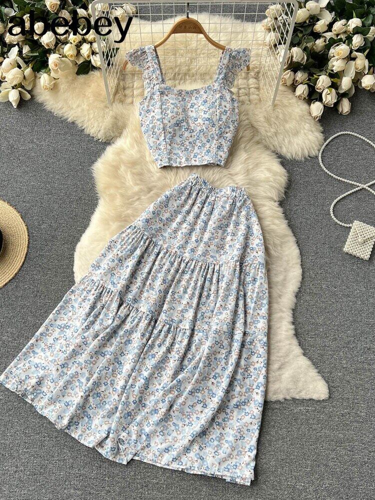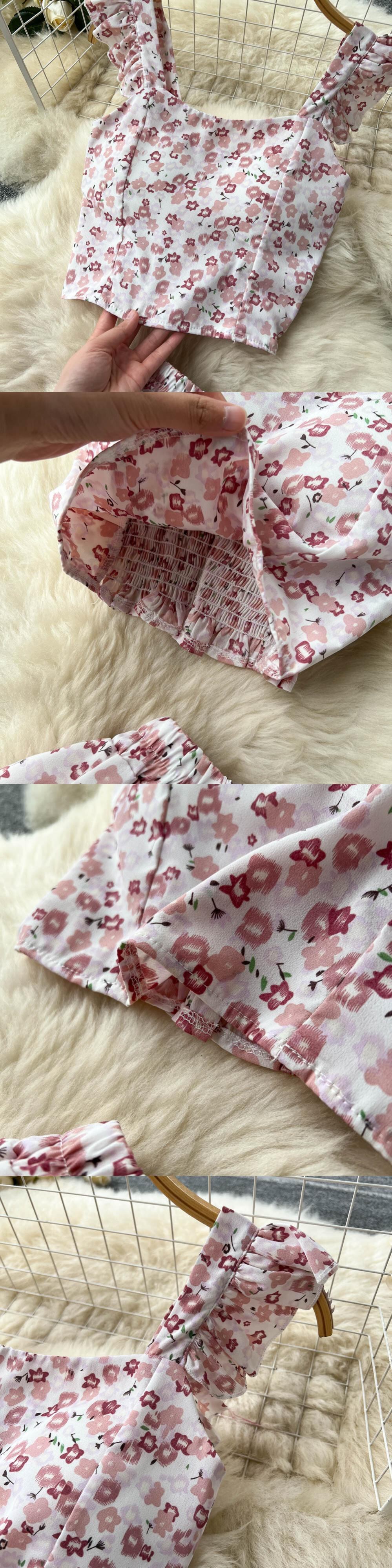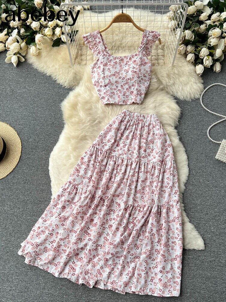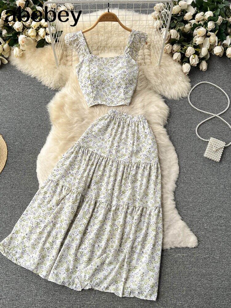 プリントツーピースセットレディーススクエアカラーノースリーブフローラルプリントトップウエストスカートヴィンテージセット2022服 花柄 スクウェア ビンテージ Abe37349688680