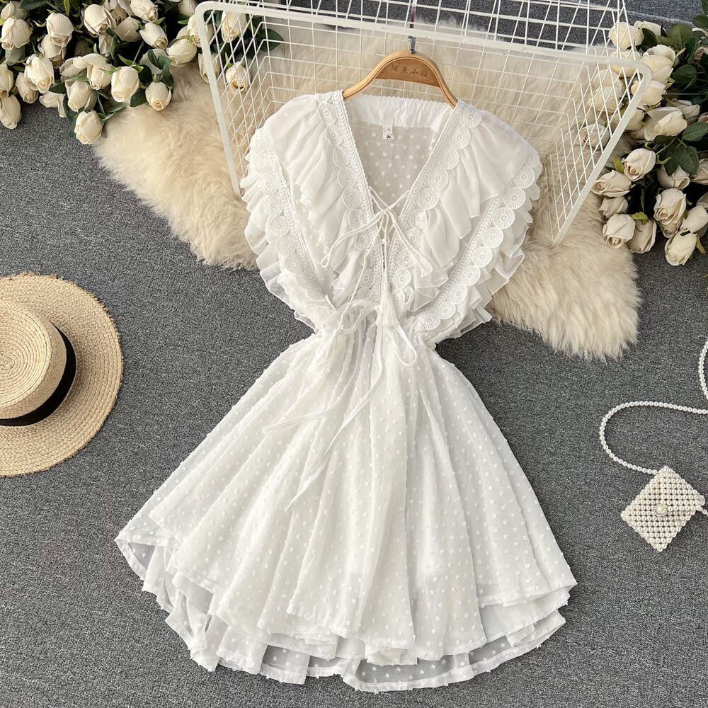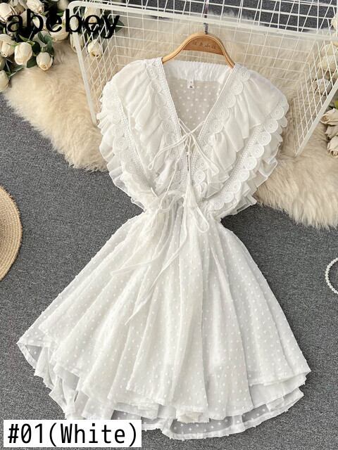 ソリッドパッチワークフリルドレス女性Vネックノースリーブウエストミニドレス夏 サマー 夏物 ソリッドカラー Abe74941078497