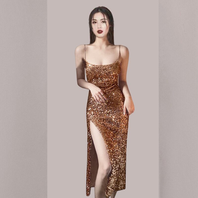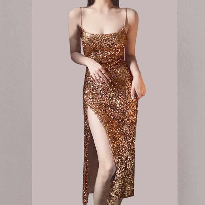 女性サマーAラインスプリットミディドレスノースリーブスリムウエストシャンパンVestidosアウターウェア 夏物 Rhc94972354308