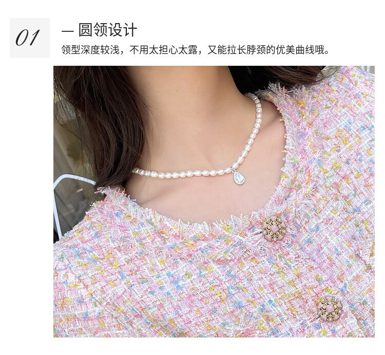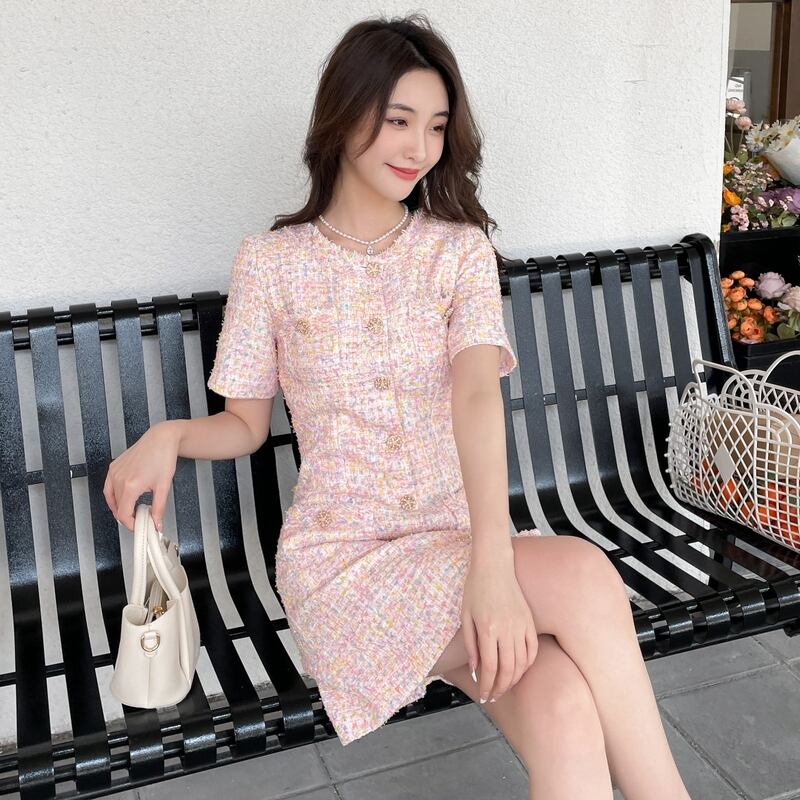 女性スモールスウィートウィンドフレンチツイード半袖ピンクシングルブレストOネック気質ショーシンパーティードレス ショート ハーフスリーブ 大人ガーリー キュート カジュアル Rhc21985107631