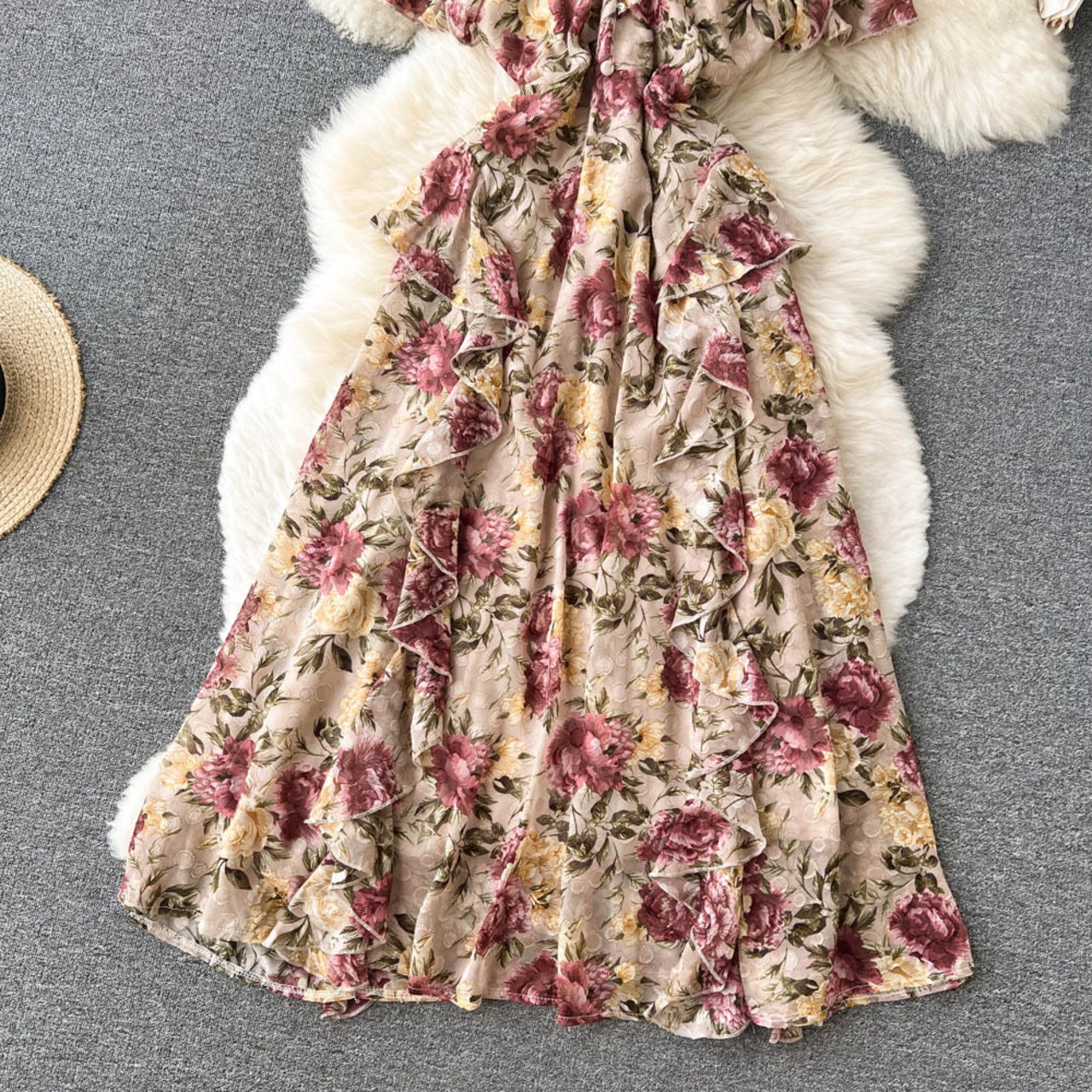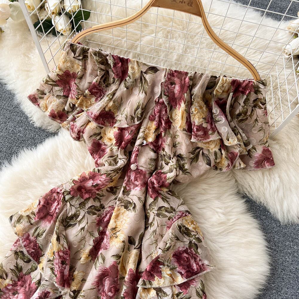 女性フローラルラップドレスオフショルダータイアップフロントフリルミディドレスサマーオフィスレディスラッシュネックプリントラインドレス 夏物 花柄 Aライン 会社 学校 通勤や通学にも Abe82606759601