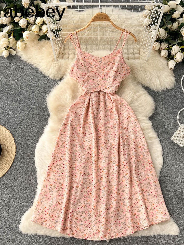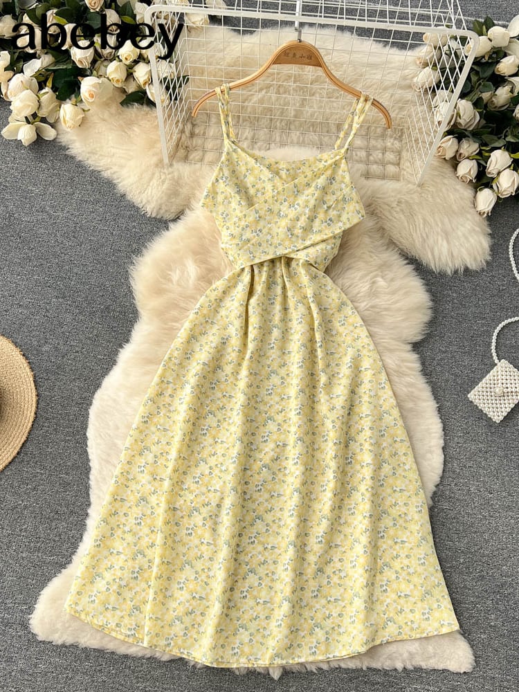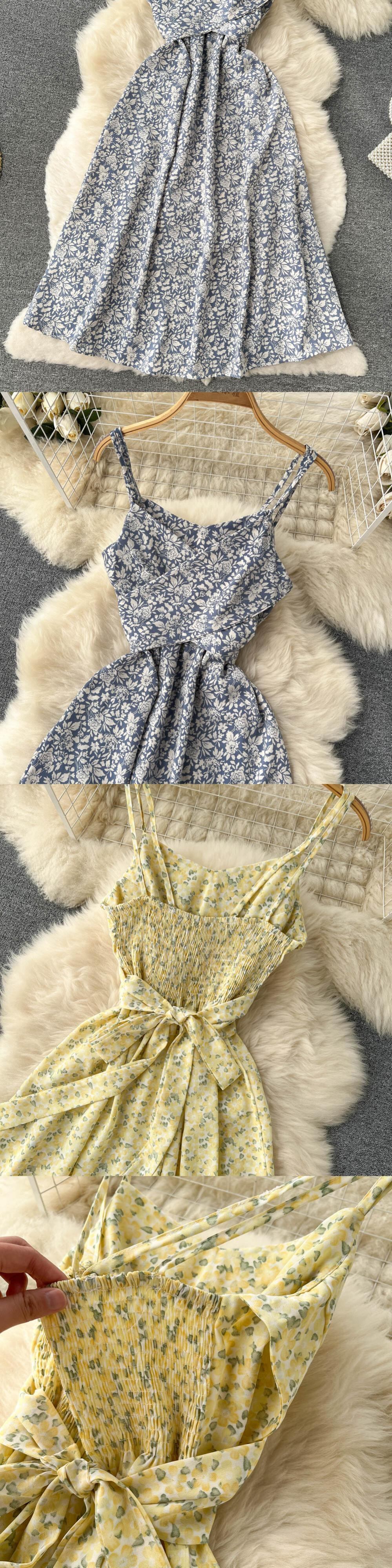 夏春フローラルドレスレディースセクシーサンドレスミディスリップバックレスプリーツスリットホワイトイエローレースアップフラワー スプリング 春物 サマー 夏物 花柄 フラワーデザイン Abe64735607447