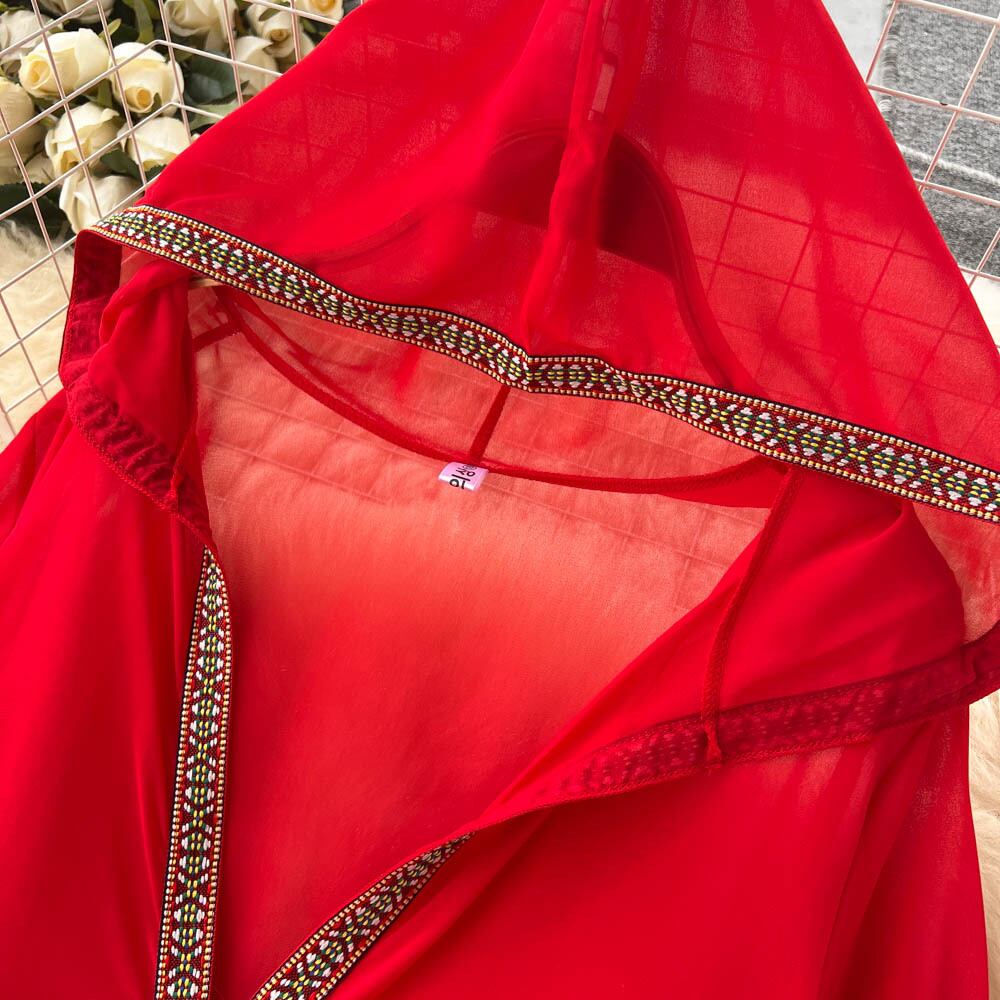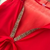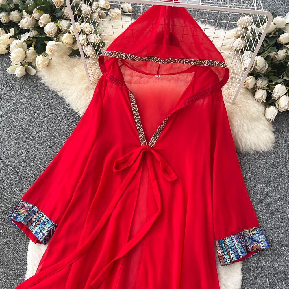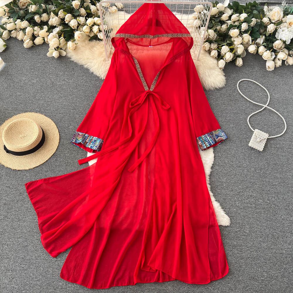 女性の秋のドレスボヘミアン刺繍フラワーVネック長袖ウエストプリーツドレスオールマッチVestidos ロング レッド オータム 秋物 フラワーデザイン Abe90474942637