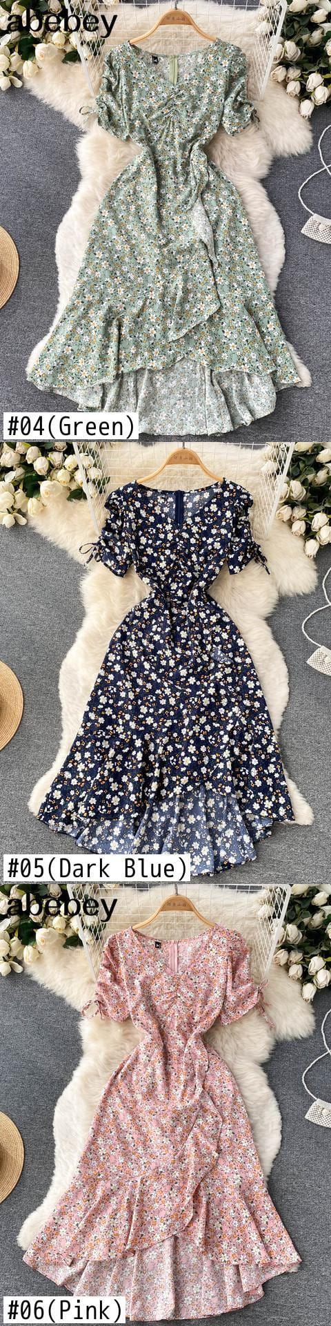 女性スウィートフローラルプリント半袖ミディドレス2022夏ヴィンテージVネックシフォンVestidos女性Aラインドレス ショート ハーフスリーブ 大人ガーリー キュート カジュアル サマー 夏物 花柄 ビンテージ Abe47233284383