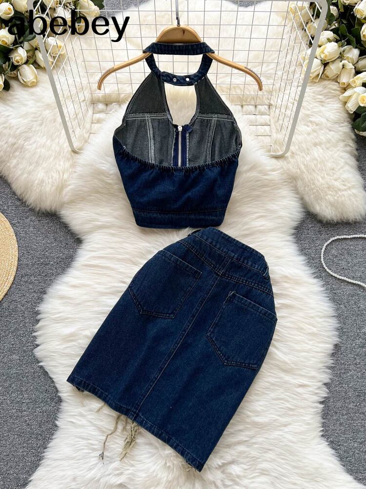 女性の夏のセクシーなデニムセットストラップレススリングジッパートップス+ショートボタンミニスカートショートジーンズツーピーススーツ サマー 夏物 Abe1121635100