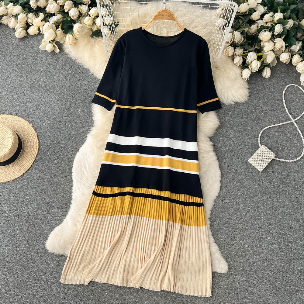 2022ボヘミアンカラーブロックストライプニットかぎ針編みのセータードレス夏の女性の半袖Oネックミディ ショート ハーフスリーブ サマー 夏物 Abe19461996931