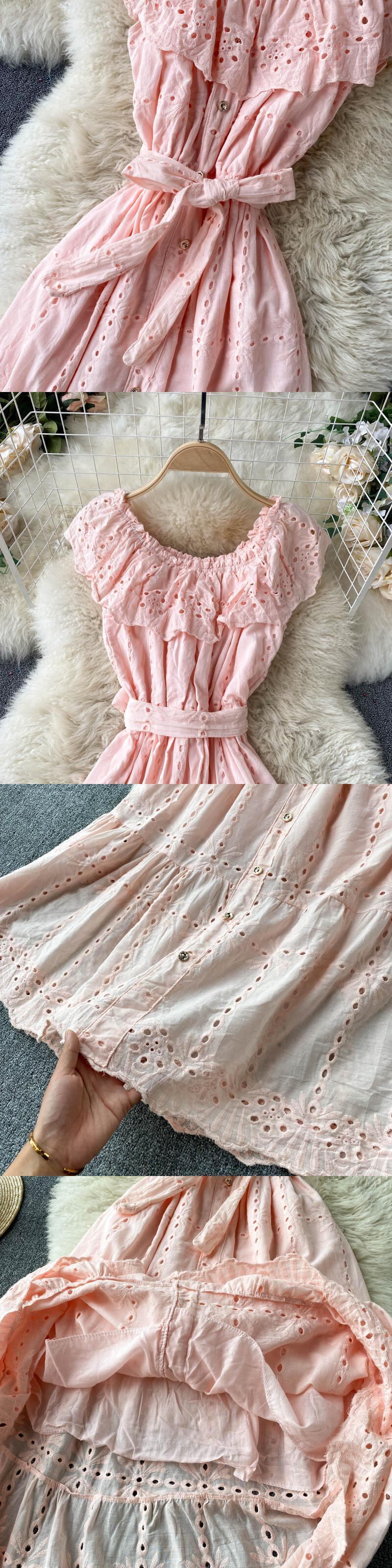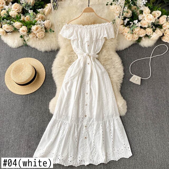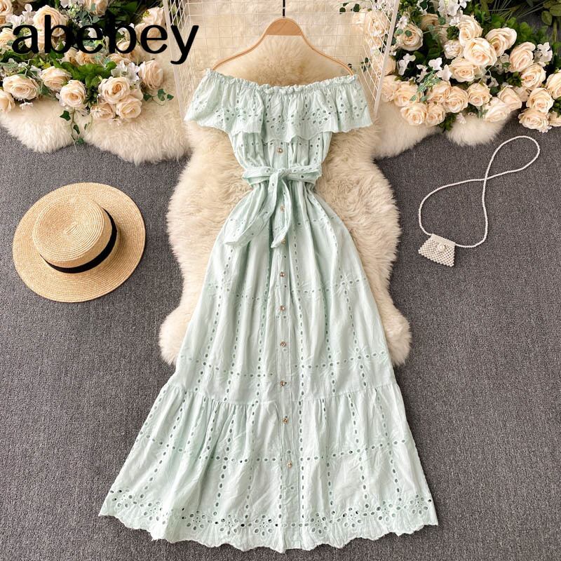 セクシーなオフショルダーフリルドレス女性スラッシュネックシングルブレストAラインドレスサマーシックホロウバケーションミディドレス ラッフル 夏物 Abe47760525809