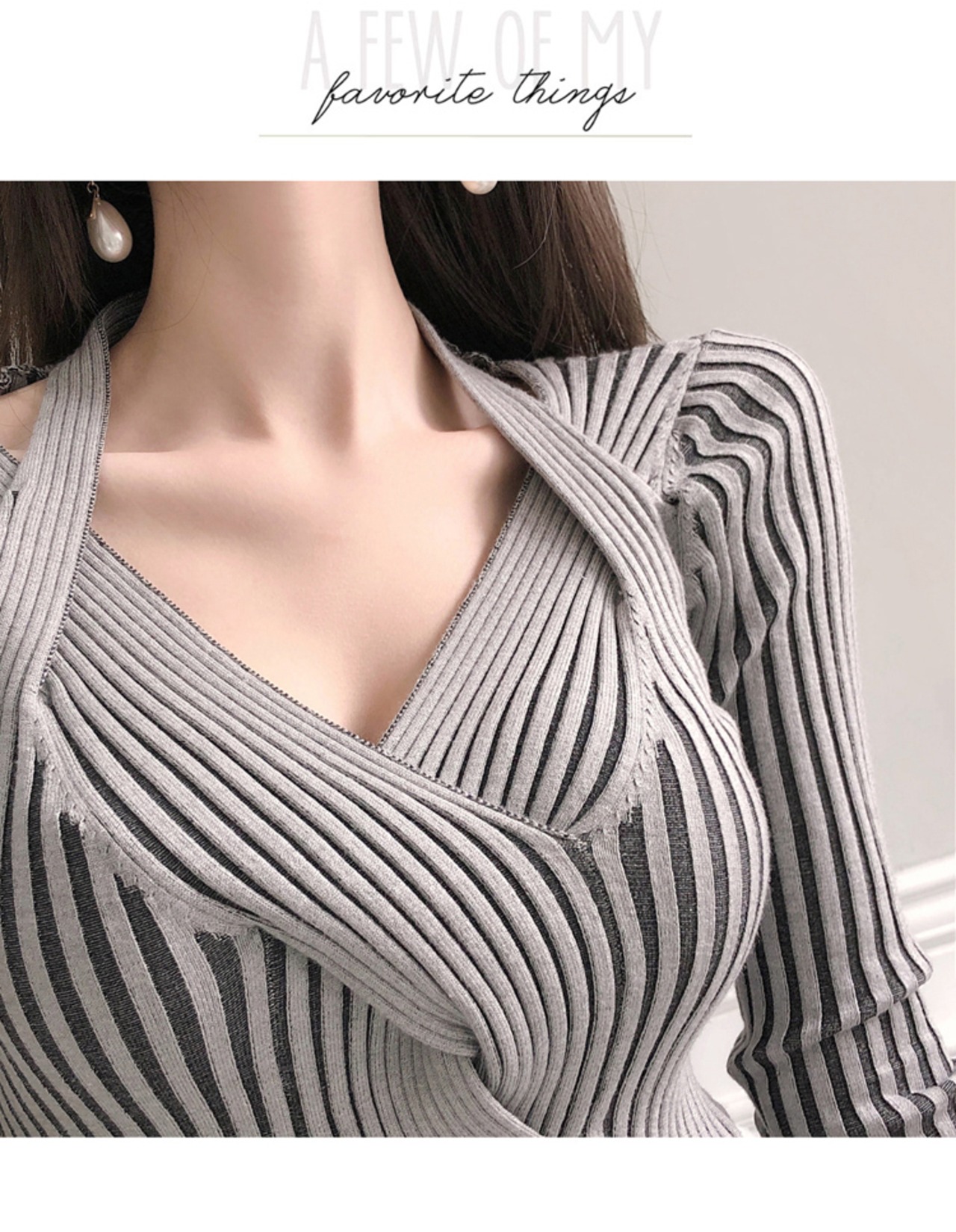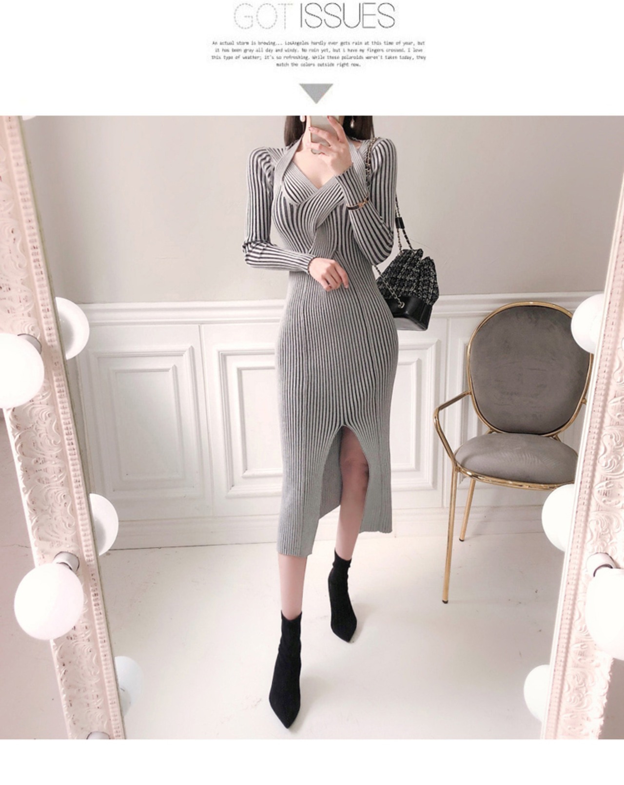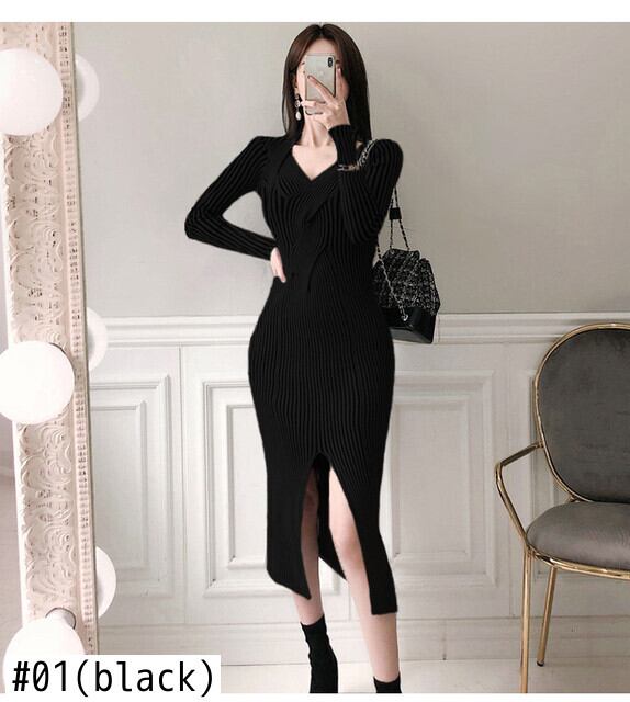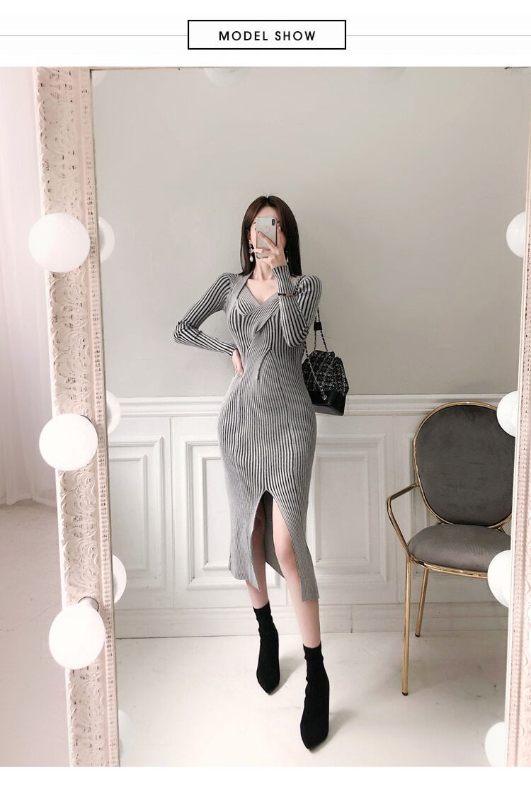 女性シッククロスVネックフルスリーブ女性ニットペンシルドレス秋スプリットスキニーパッケージヒップセーターVestidos オータム 秋物 Rhc34816285924