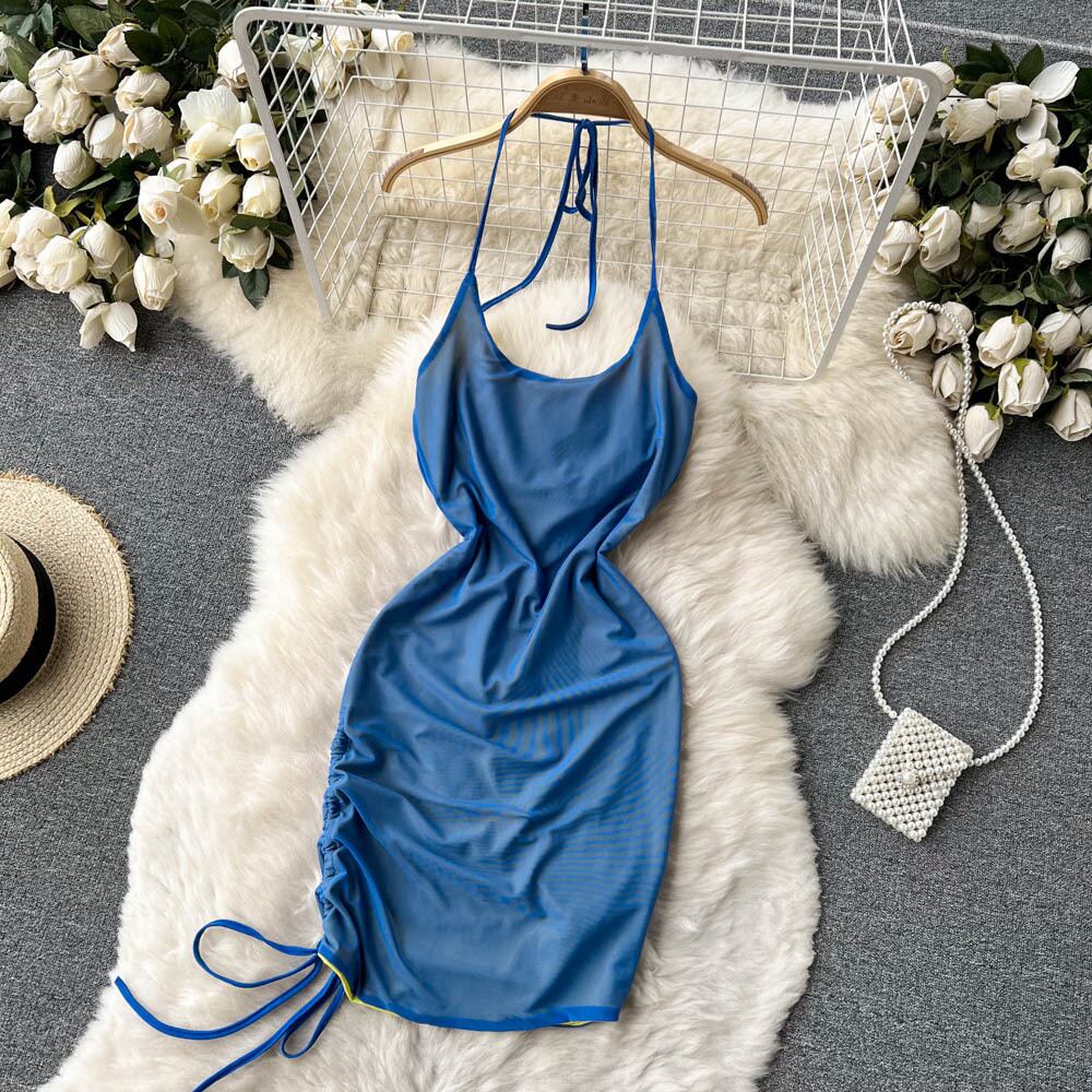 2022サマーストラップセクシードレスノースリーブミニビーチサンドレスフレンチストリートウェアメッシュソリッドショートスリムドレス 夏物 ソリッドカラー Abe27106015753