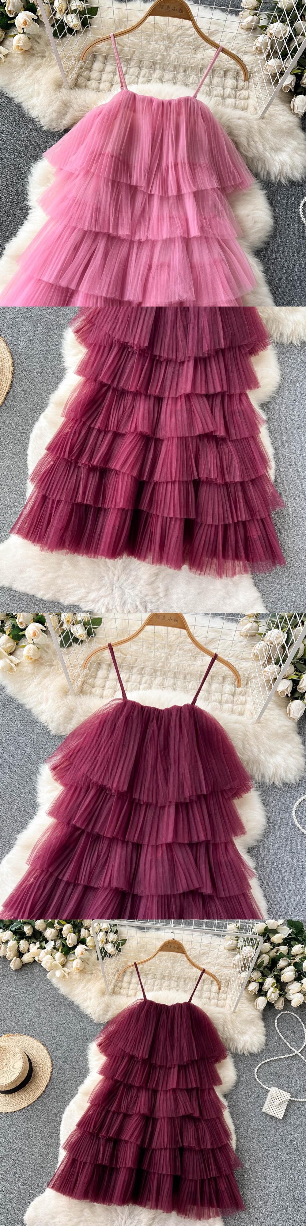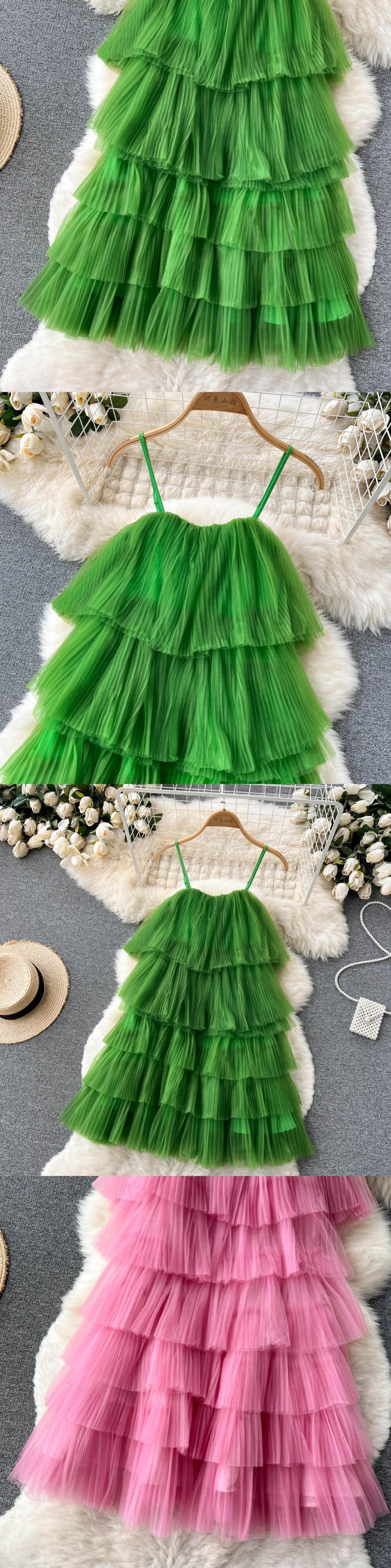 2022年女性レトロフリルピンク/グリーンストラップドレスメッシュスプライスウッドイヤー裾ケーキミニパーティードレスローブヴェスティド衣装 ラッフル Abe34536829624
