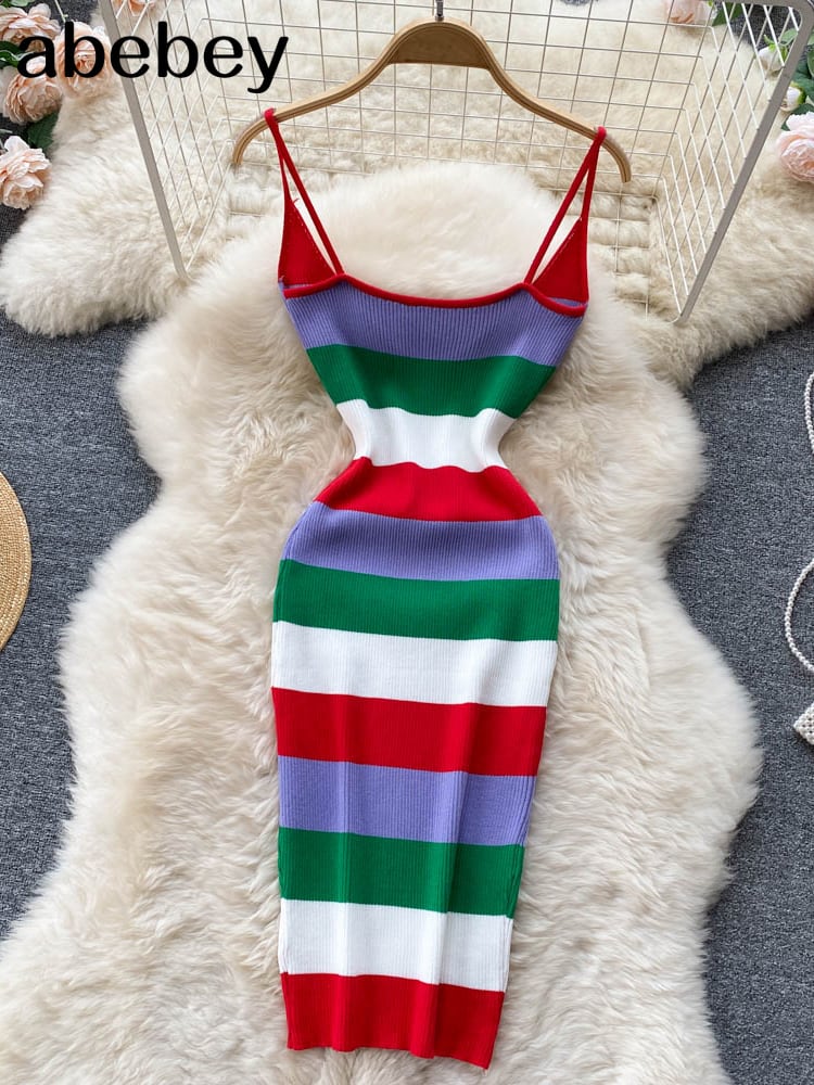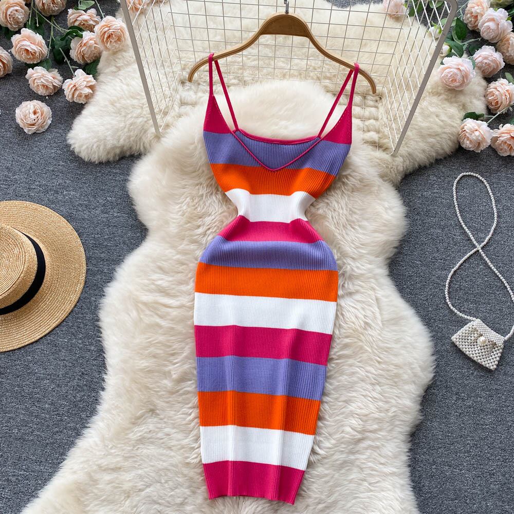 ストライプサマーニットセクシーストラップドレス女性Vネックエラティックウエストボディコンサンドレスビーチバックレスミディドレス 夏物 Abe35664489500