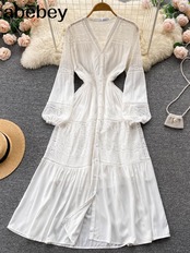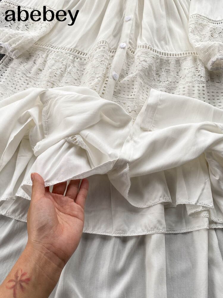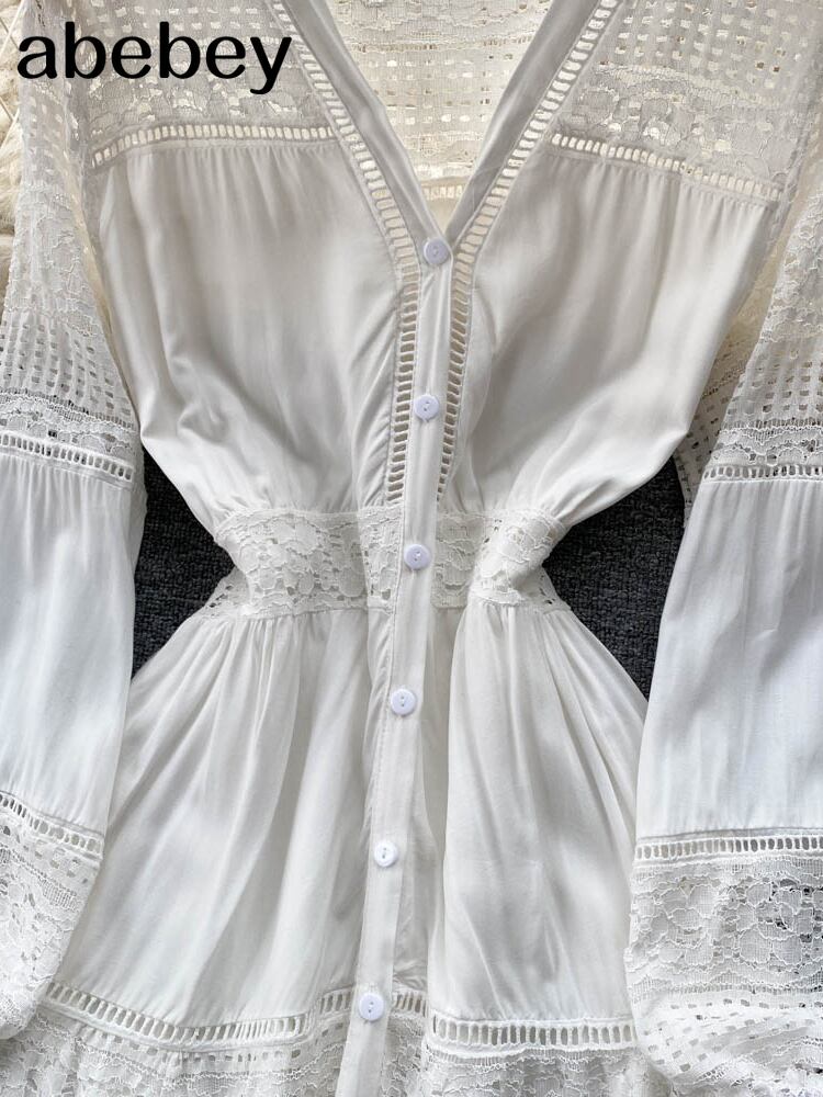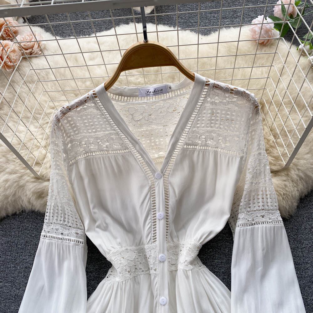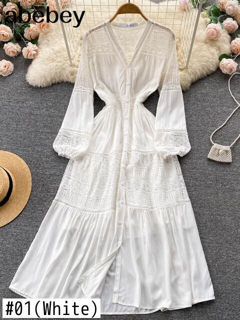 ホワイトレースフレンチスタイルロングドレス夏の女性2022Vネックロングランタンスリーブセクシーな休暇Aラインビーチマキシドレス サマー 夏物 Abe55332916945