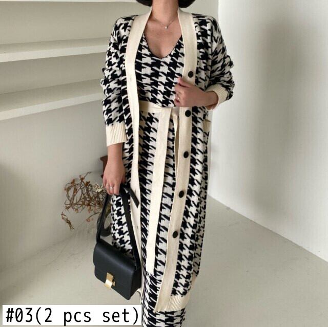 2020セーターセットヴィンテージスタイルVネックロングニットセーターコート+千鳥格子ベストドレスツーピーススーツ ビンテージ Rhc19826082063