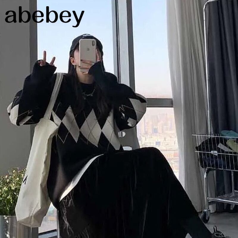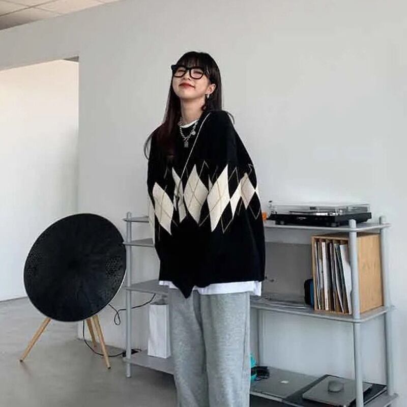 女性のニットセータープルオーバー冬のルーズストリートウェアスタイルの女性ジャンパーヴィンテージアーガイル服 ウィンター 冬物 ビンテージ Abe91401692758