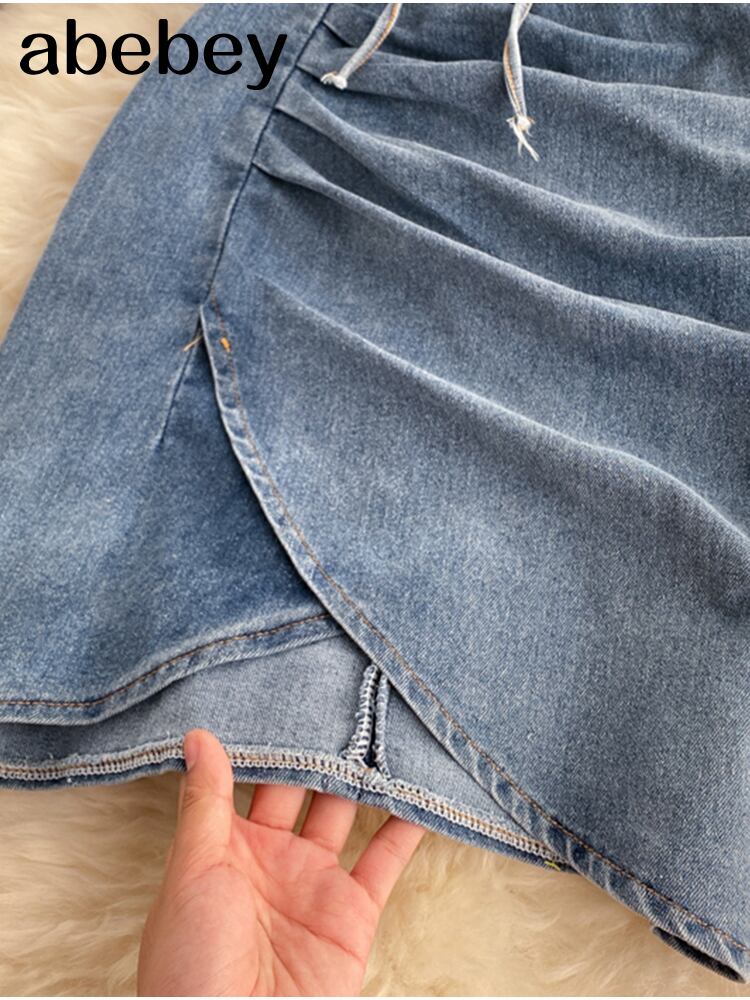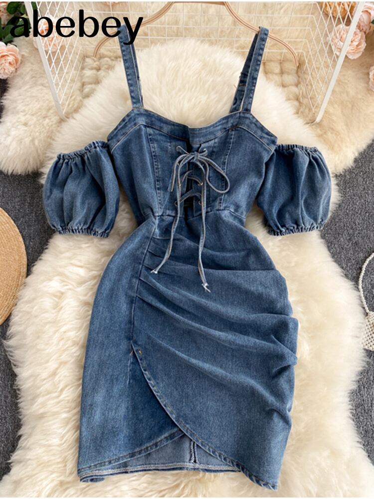 女性レトロデニムストラップドレスパフスリーブシングルブレストAラインドレスサマーセクシーオフショルダースプリットミディドレス 夏物 Abe57009860292