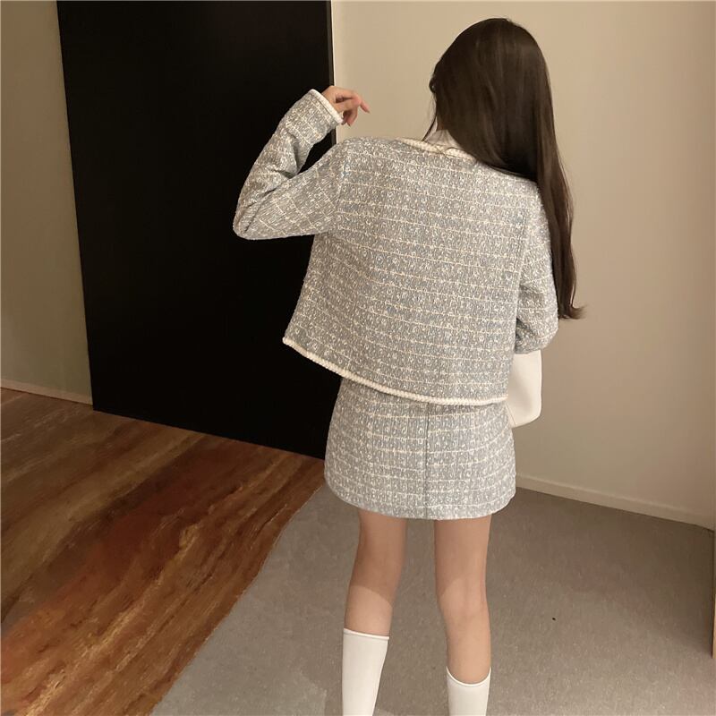 2021年秋2点セットヴィンテージチェック柄ツイード長袖ジャケットコート+不規則なAラインミニスカートスーツ ロング オータム 秋物 ビンテージ Rhc6005953509