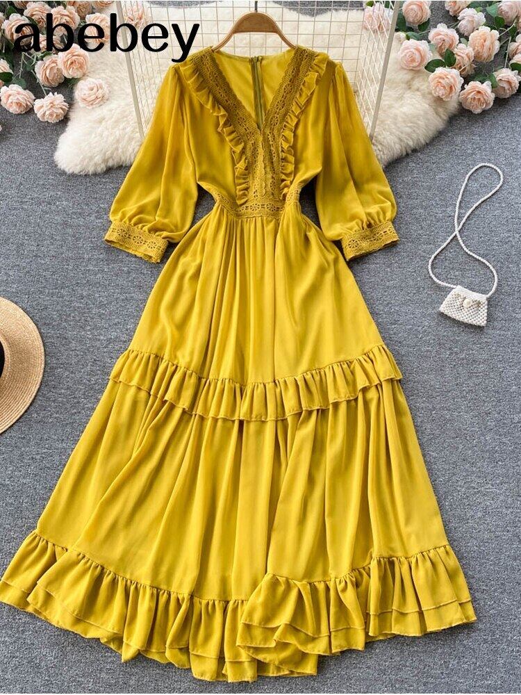2022年女性サマーマキシドレスシフォンVネックAライン半袖マキシドレスパフスリーブイエローロングドレス ショート ハーフスリーブ 夏物 Abe95973591546