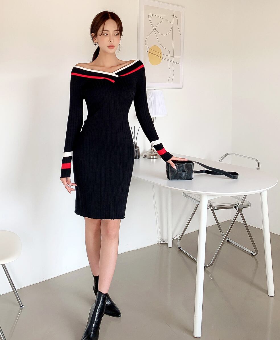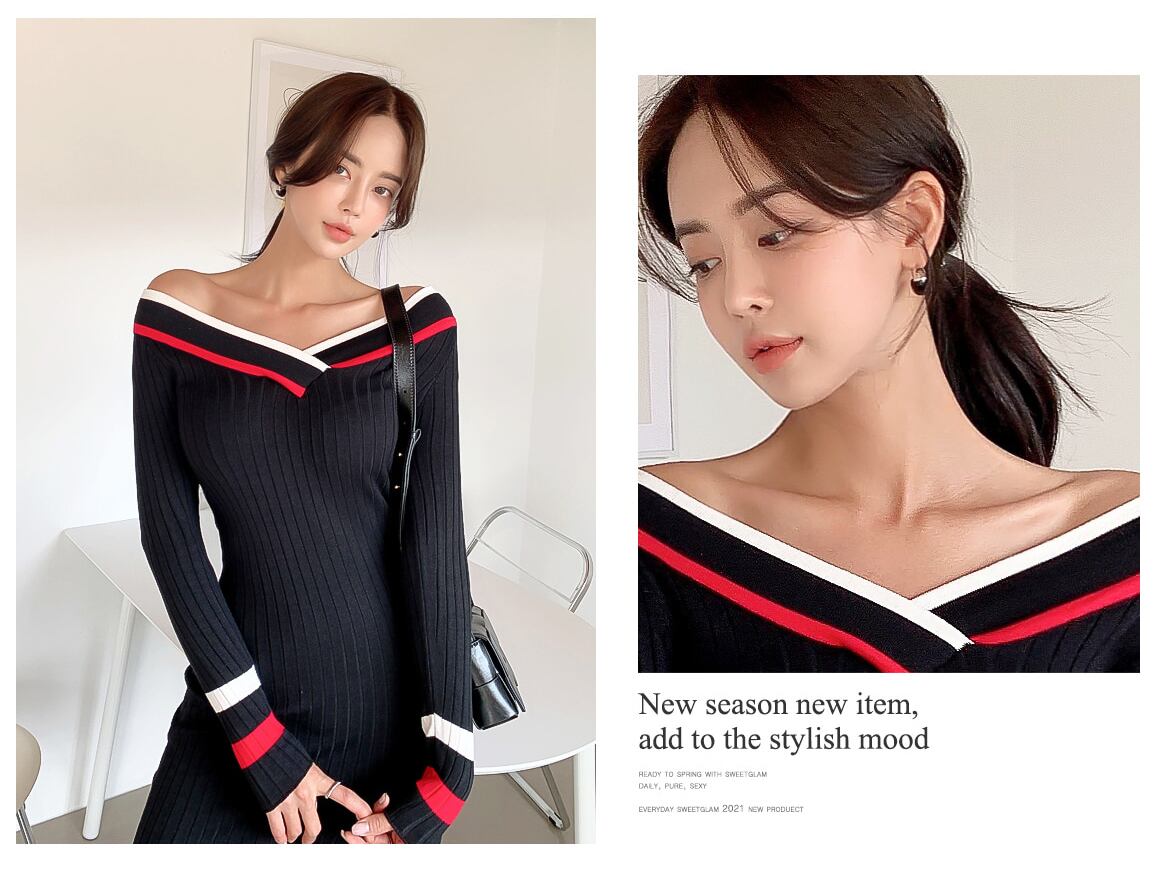 女性のシンプルなスラッシュネックニットドレスオフィスペンシルシースドレス弾力性カラーブロックボディコンVestidos エラスティック 伸縮 会社 学校 通勤や通学にも Rhc77472282408