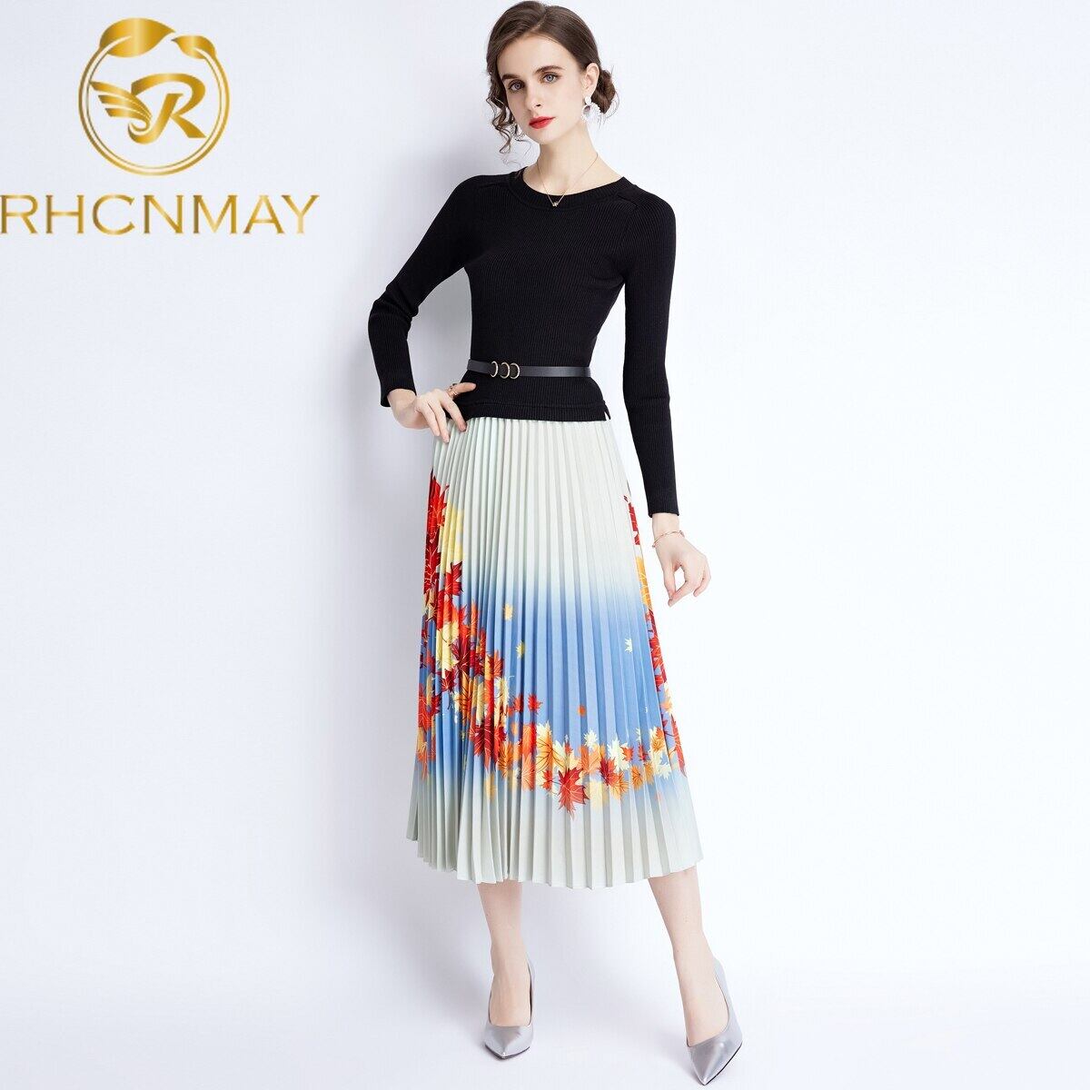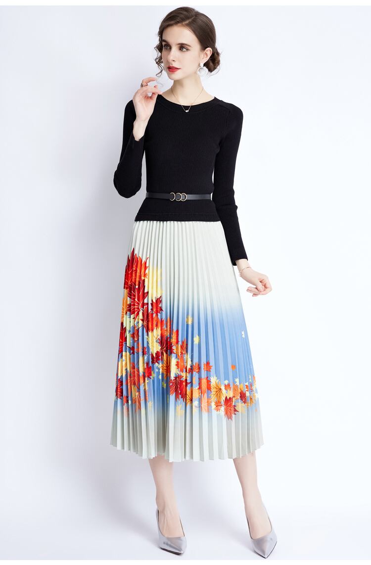 秋冬長袖グラデーションカラープリントプリーツ編みセータードレス女性バック中空ミディVestidos ロング オータム 秋物 ウィンター 冬物 Rhc47766714646