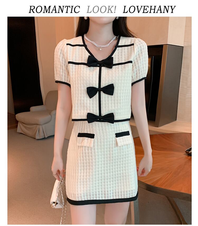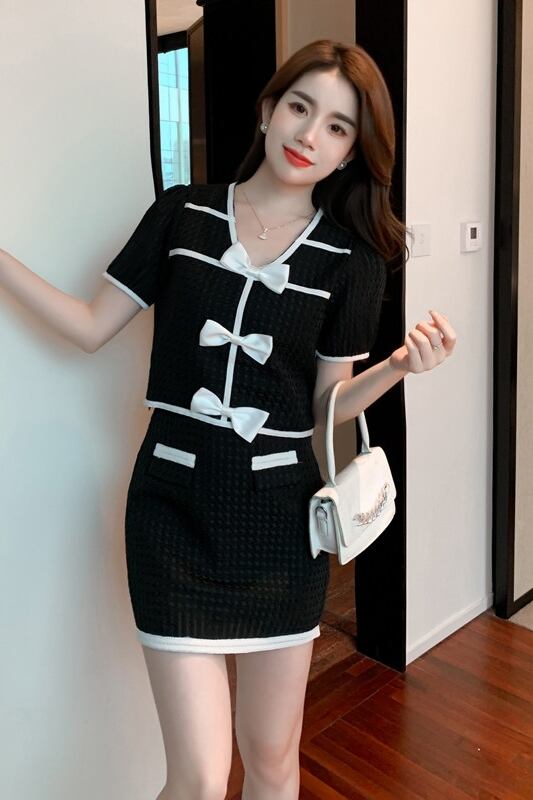 スモールフレグランス半袖Vネックニットボウノットトップ+ウエストバッグヒップスカートスーツレディース ショート リボン ハーフスリーブ Rhc10868523935