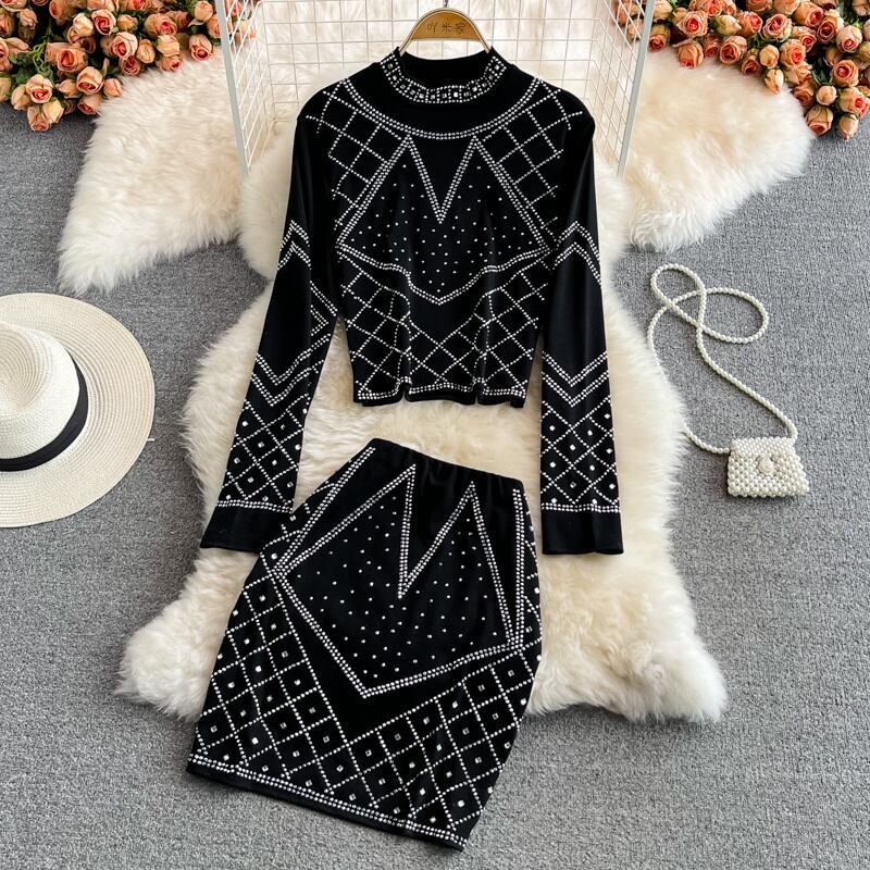 女性スタンドアップカラーラインストーンストレッチスリムトップウエストスカートショートツーピースセット2022年秋11D5632 オータム 秋物 Abe96233368045