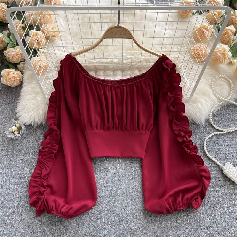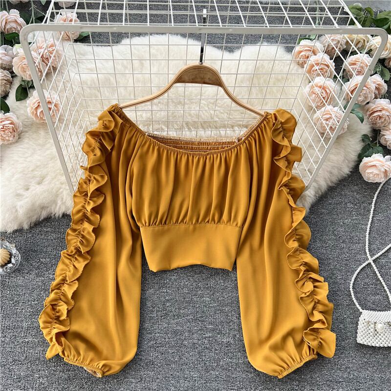 オフショルダーブラウス女性スラッシュネック長袖ソリッドスリムシャツ2022春のストリートウェアショートトップ ロング スプリング 春物 ソリッドカラー Abe14666620437