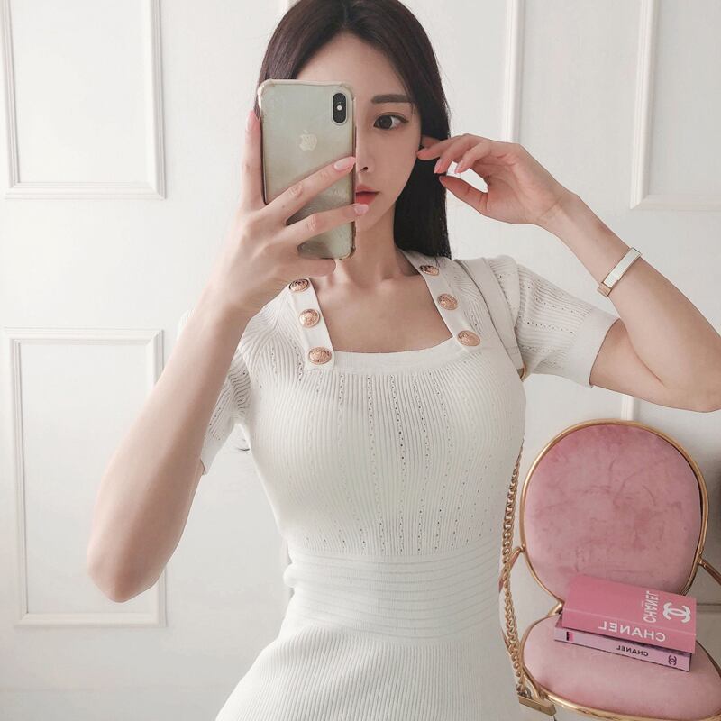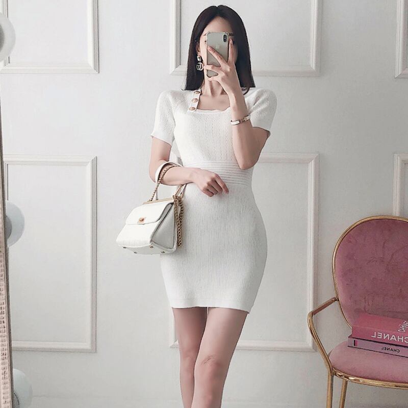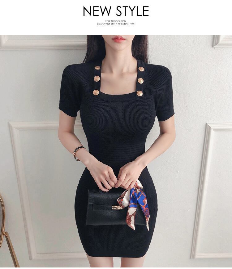 ニットドレススクエアネック半袖バックジッパーゴールドボタンミニスカートボディコンレディースセクシードレス2021夏 ショート ハーフスリーブ サマー 夏物 スクウェア Rhc94710265642