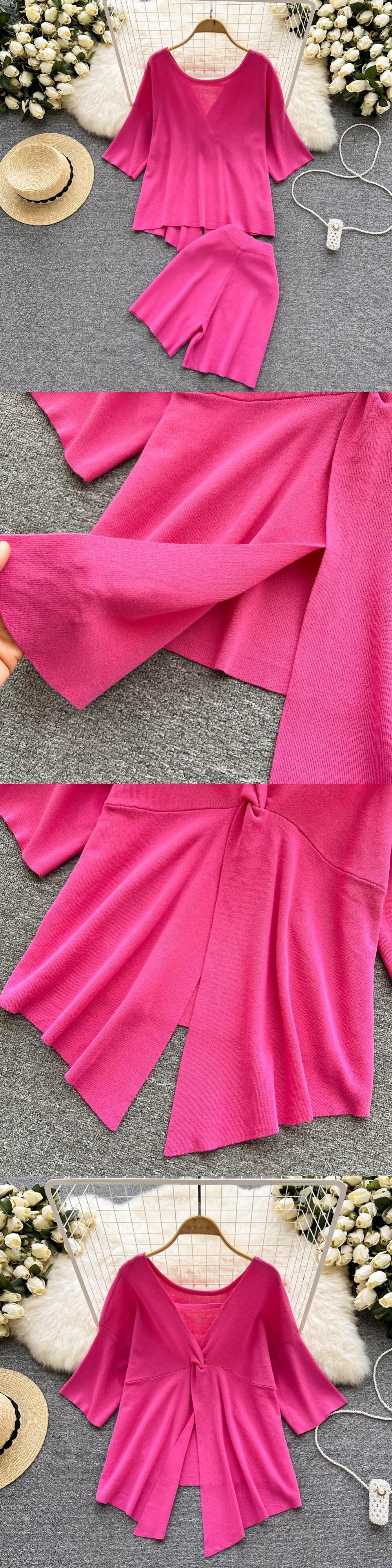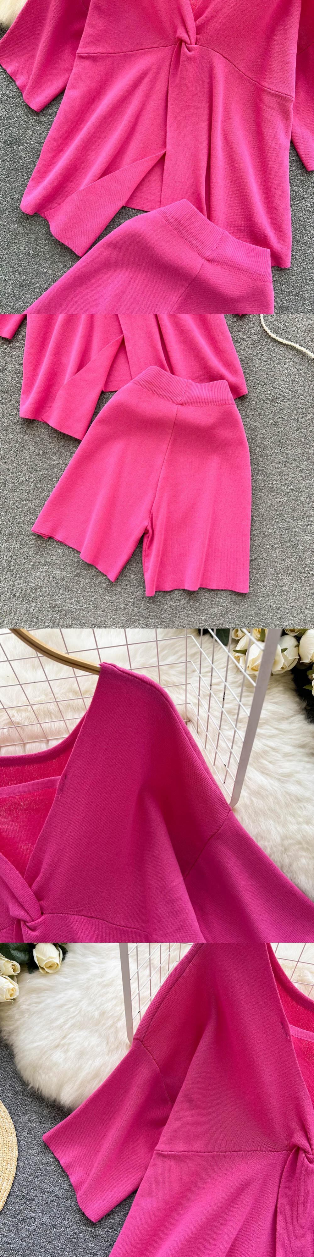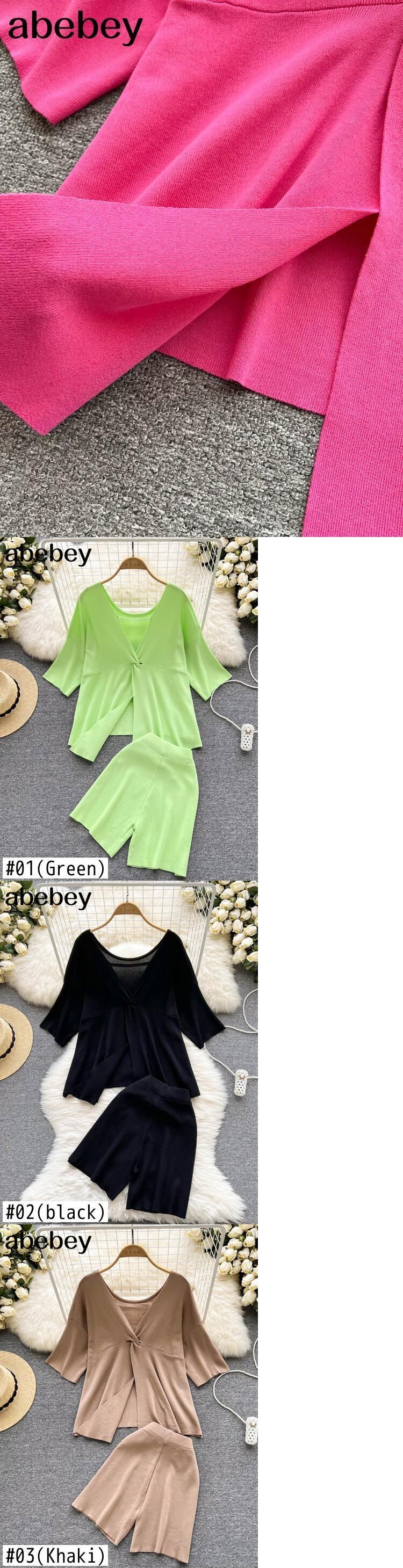 ツーピースの衣装の女性のニットの装飾ウエストソリッドショーツ+Vネック半袖プルオーバートップス ショート ハーフスリーブ ブルマー ソリッドカラー Abe38883315951