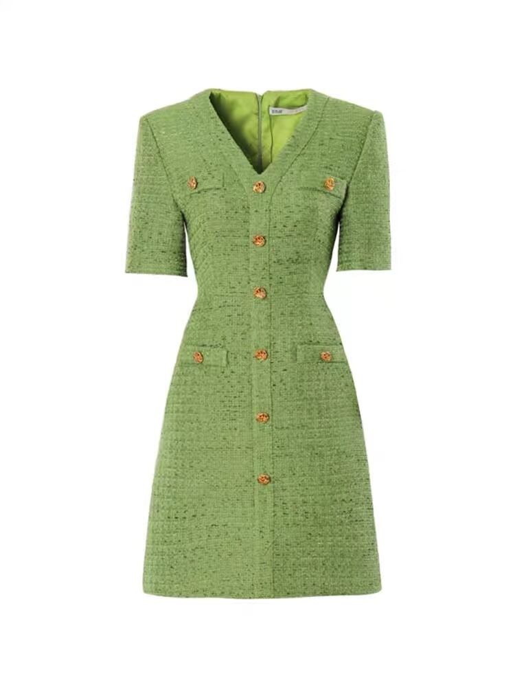 女性スウィートツイードドレスサマーヴィンテージVネックAラインスモールフレグランススタイルグリーンパーティードレスシックな服 大人ガーリー キュート カジュアル 夏物 ビンテージ Rhc65238466447