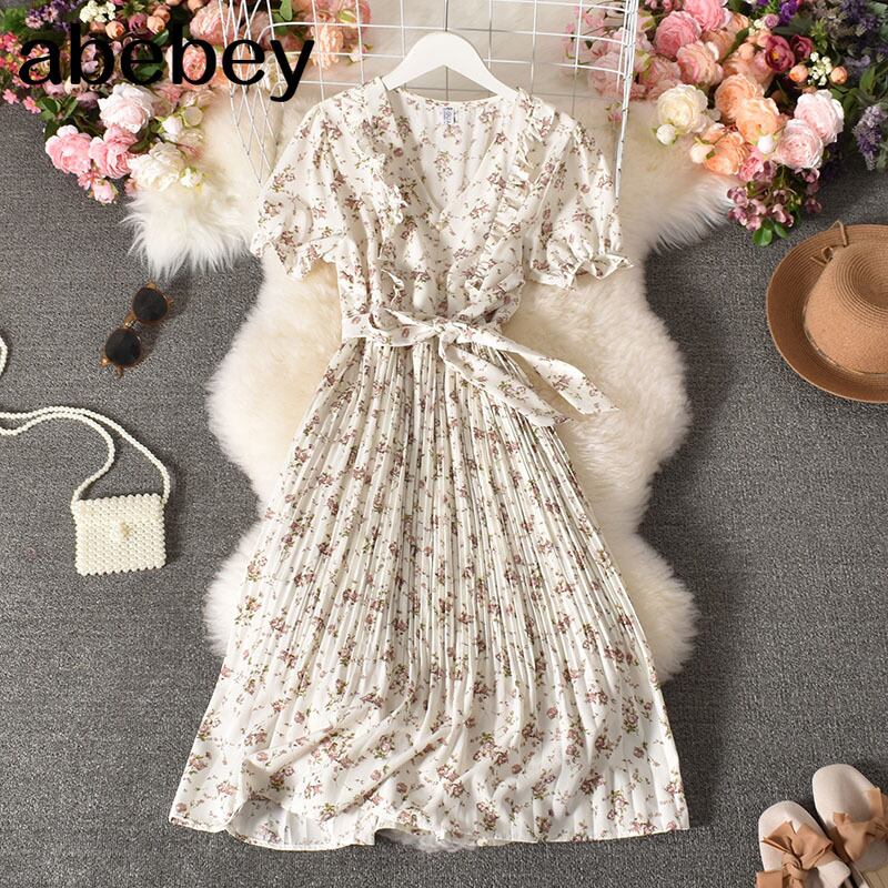女性フローラルプリーツドレスVネックパフスリーブレースアップAラインドレスサマーボヘミアンプリントホリデービーチドレス 夏物 花柄 Abe61307176947