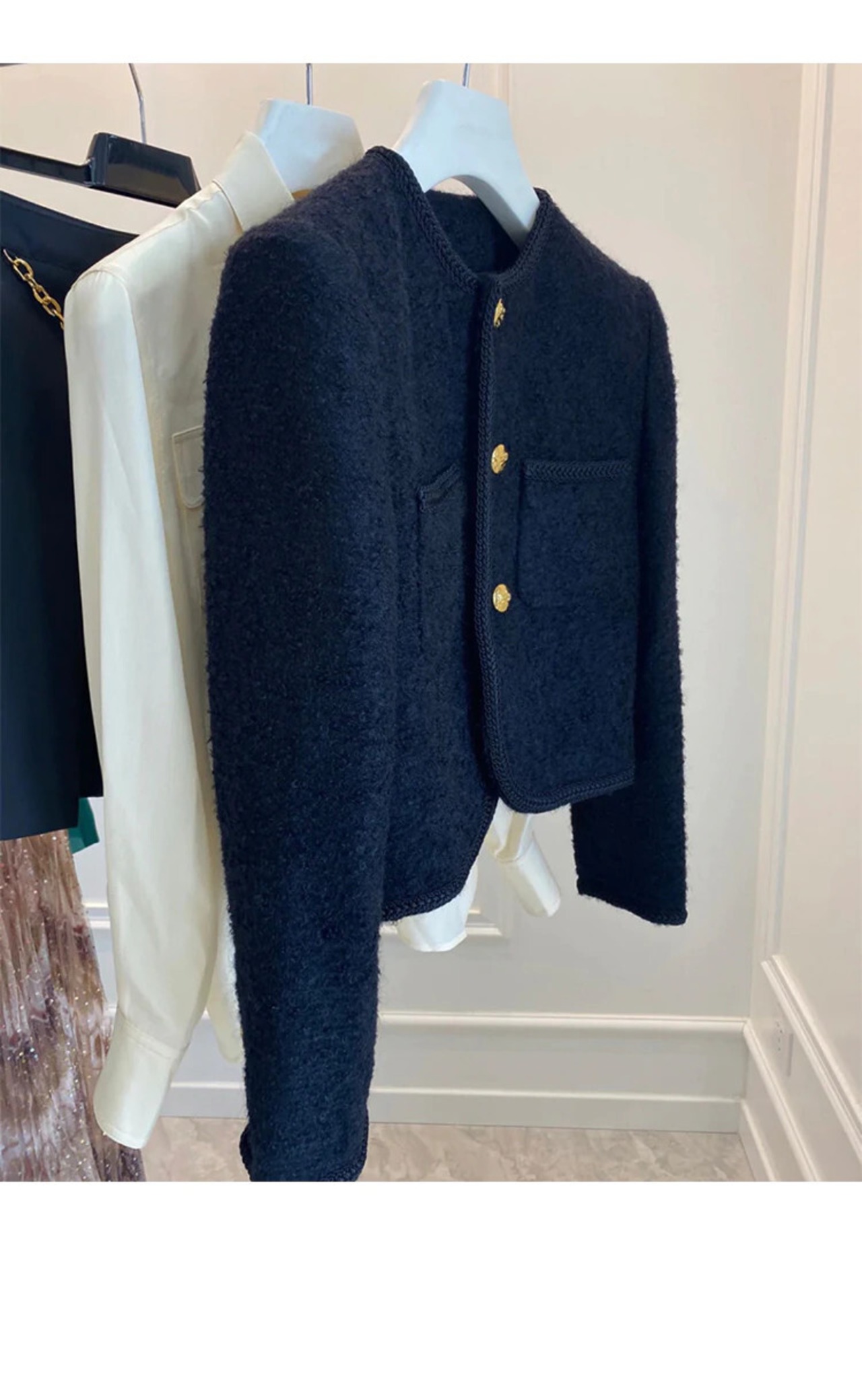 女性ジャケットブラックツイード2ポケットゴールデンボタンコート春秋女性服 スプリング 春物 オータム 秋物 Rhc81162322224