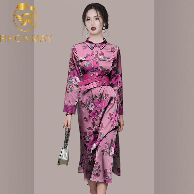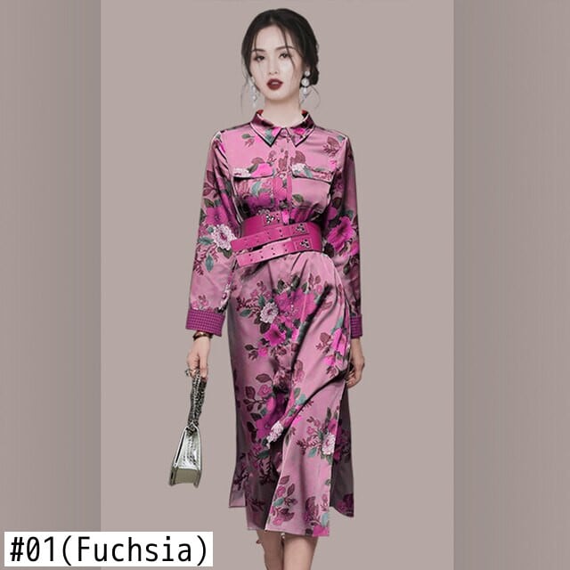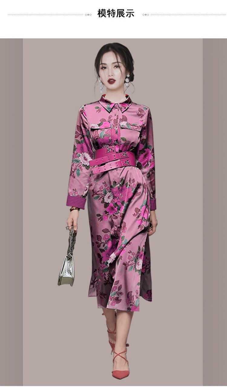 秋のヴィンテージイングランドスタイルパープルフラワーミディドレス女性女性オフィスワークドレスラペルネックドレスベルト付き オータム 秋物 ハーネス フラワーデザイン ビンテージ ヨーロピアン 会社 学校 通勤や通学にも Rhc4516161667