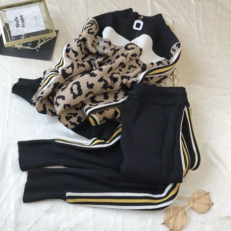 トラックスーツ女性ヒョウニットジップカーディガントップス+パンツスーツ2PCSセット長袖ジャケットコート女性セーターズボンスーツ ロング Rhc88935514569