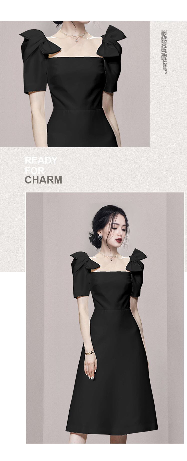2021サマードレスレディーススクエアカラーボウ半袖ブラックオフィスAラインニードレス ショート リボン ハーフスリーブ 夏物 スクウェア 会社 学校 通勤や通学にも Rhc18590981187