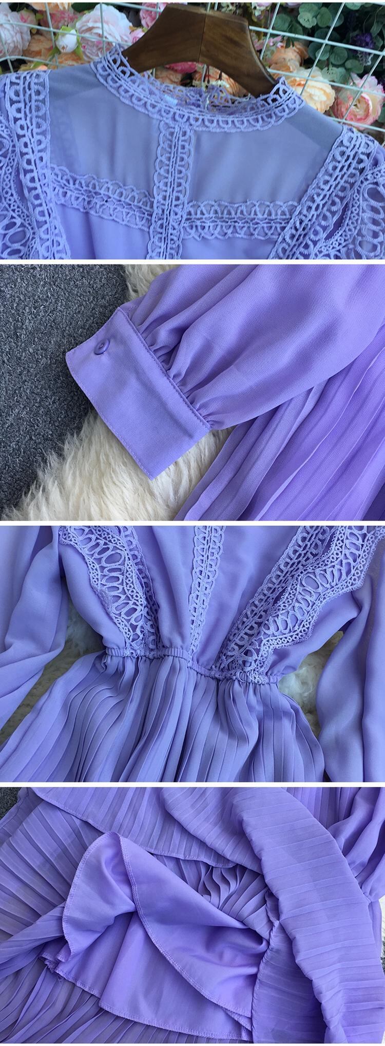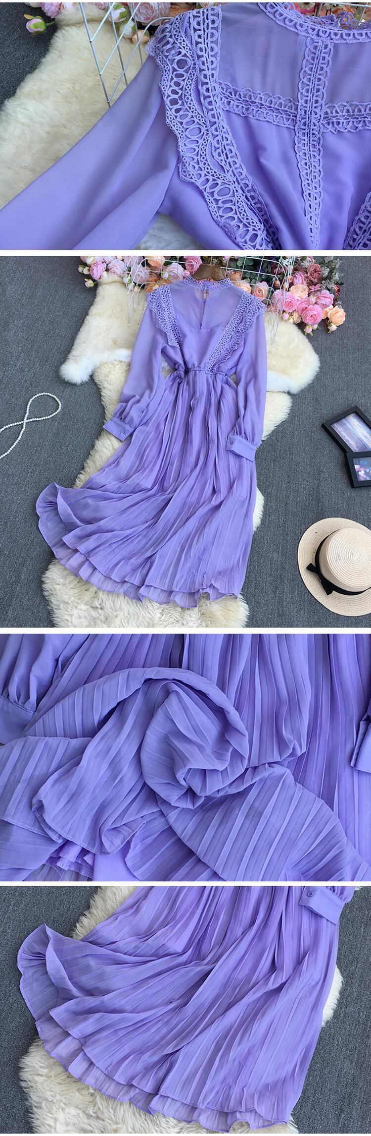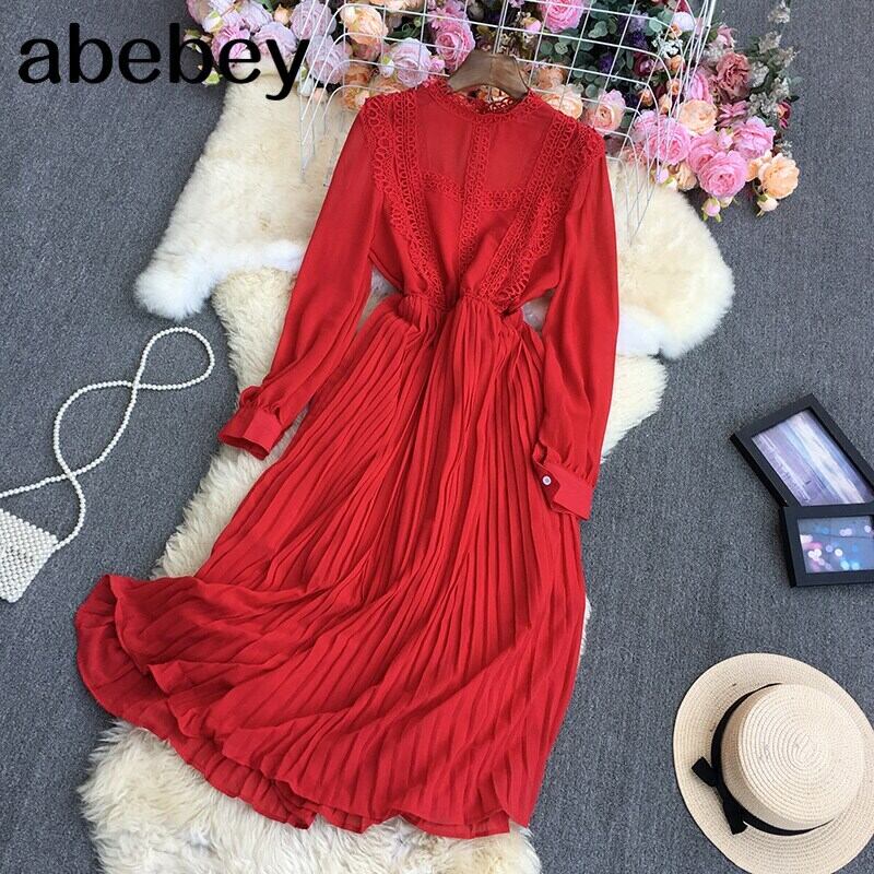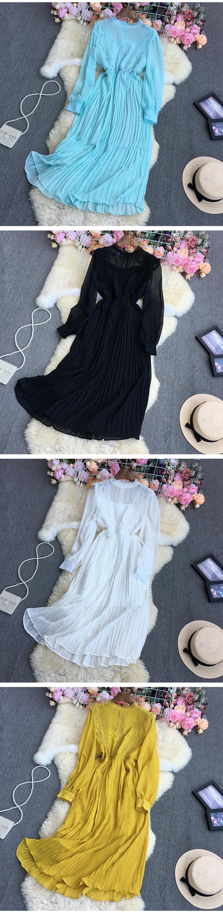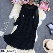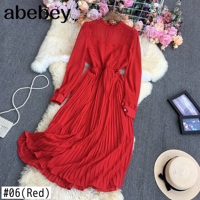 2022年春秋ヴィンテージスタンドカラー長袖ワンピースレースパッチワークハイウエストミドル丈Aラインプリーツワンピース ハイウェスト ロング スプリング 春物 オータム 秋物 ビンテージ Abe56622589111