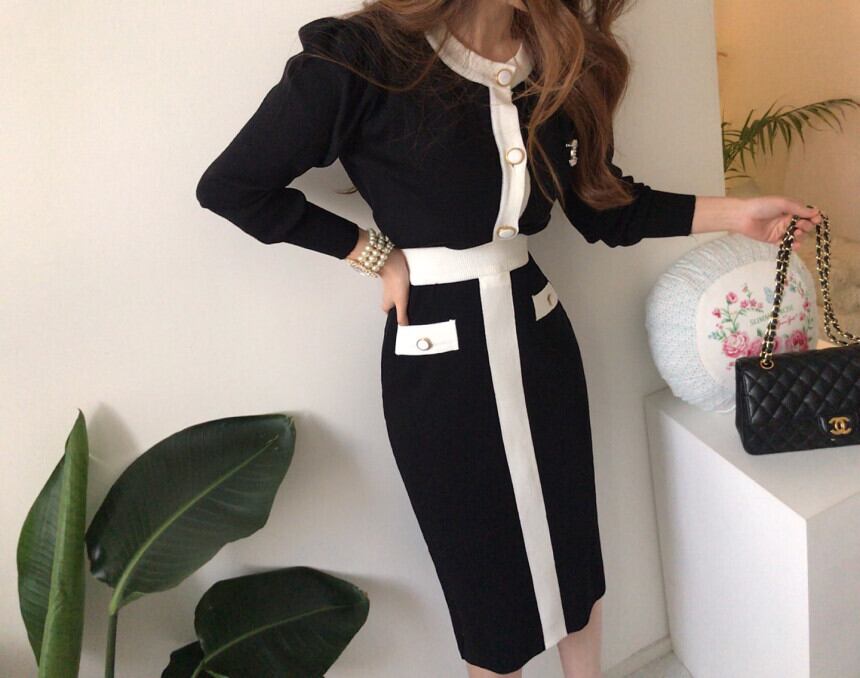 2020秋ニットカラーブロックツーピースセット女性長袖カーディガン+伸縮性ウエストロングスカートスーツ衣装 エラスティック オータム 秋物 Rhc4928084581