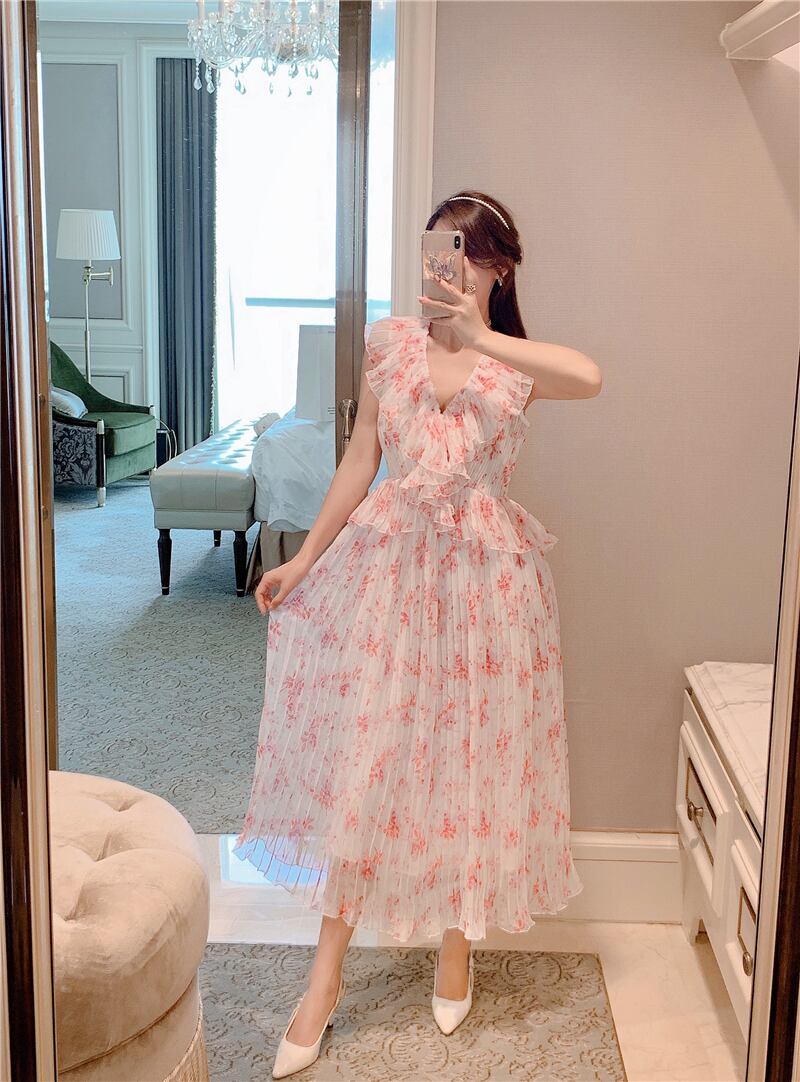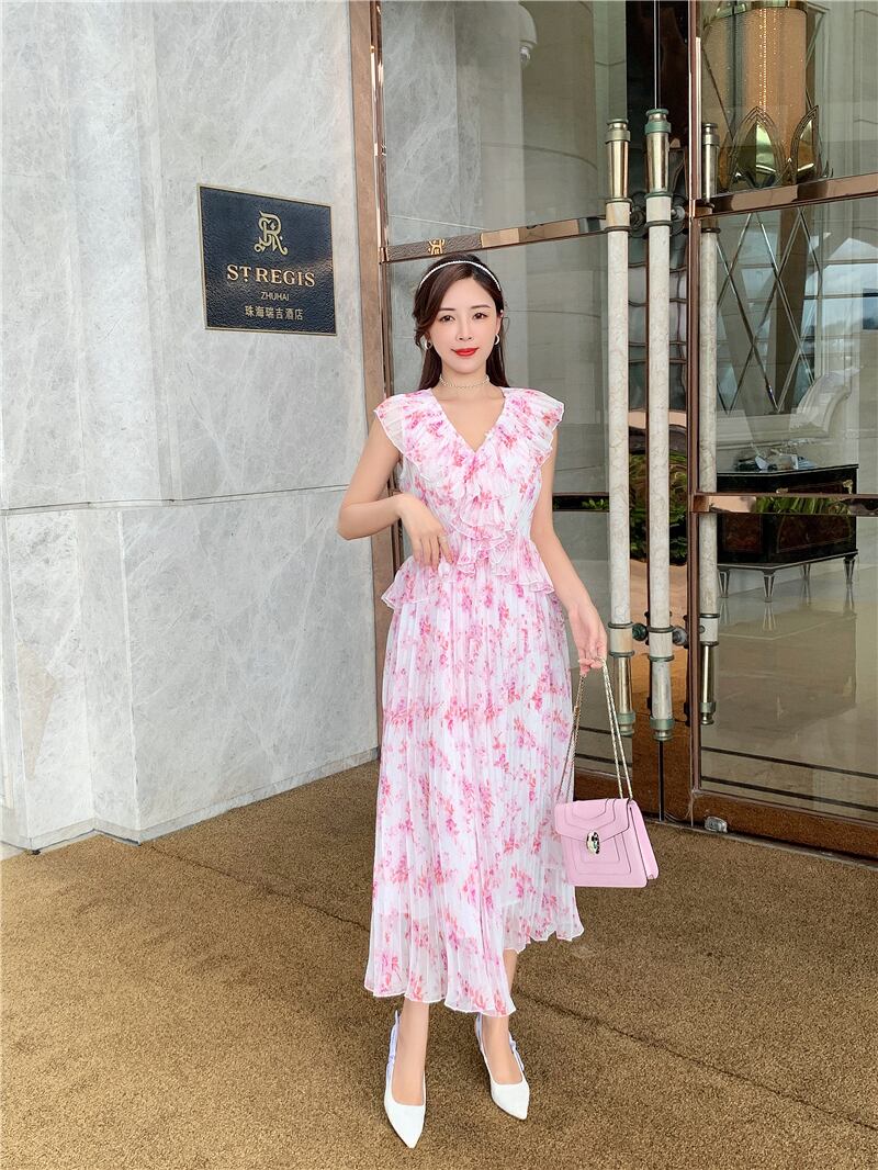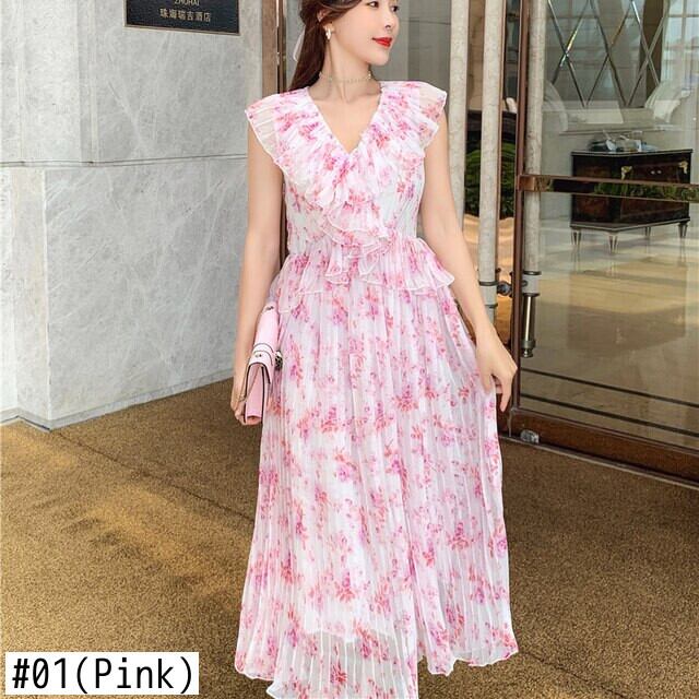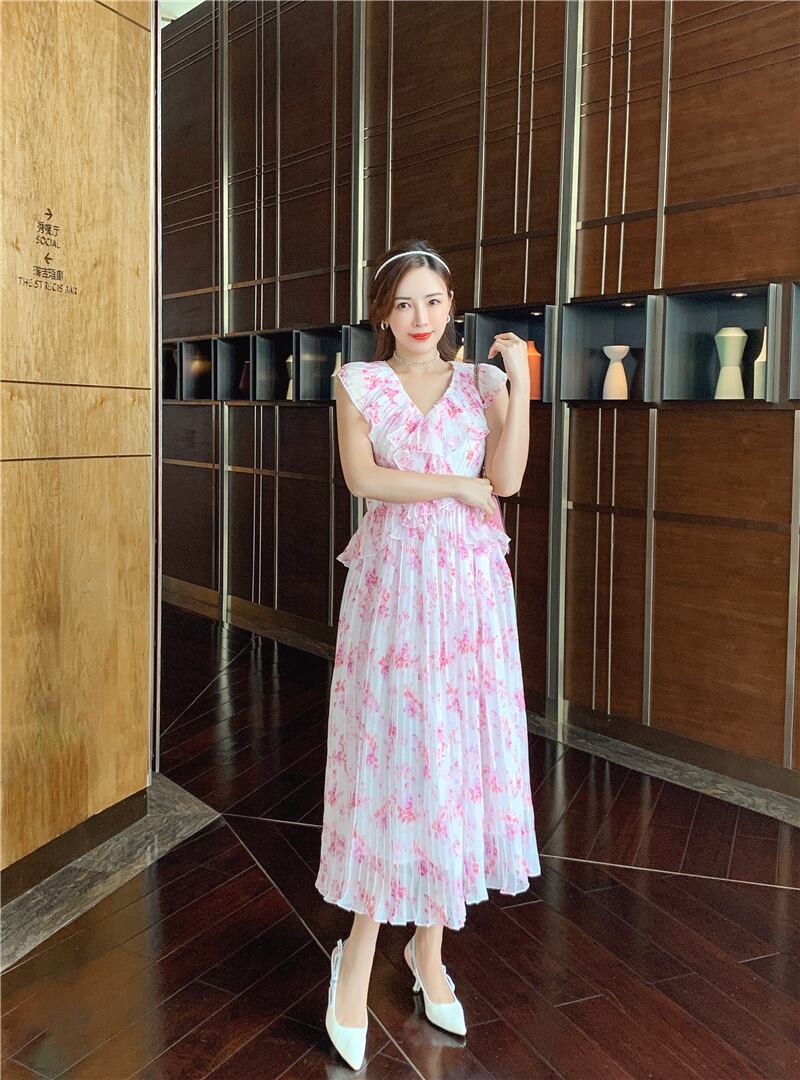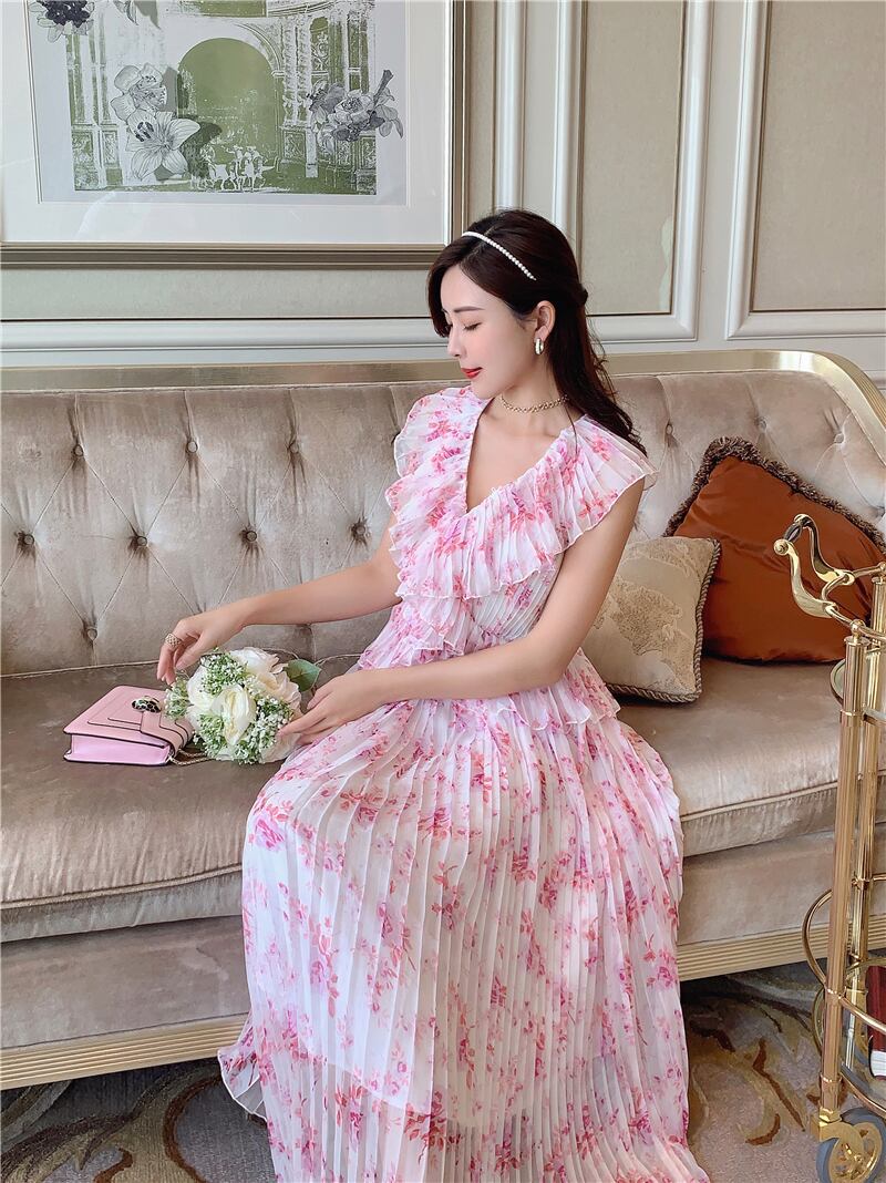 ランウェイVネックプリーツフローラルレディレディースフェアリーボヘミアンサマードレスピンクドレスVestidosスリムフリル合計 ラッフル 夏物 花柄 Rhc27957000863
