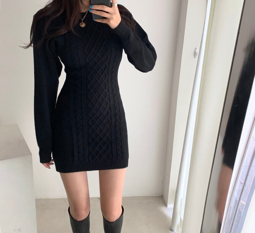 中空アウトウエストセータードレス女性秋冬伸縮性ツイストニットドレスボディコンミニドレス3色 エラスティック オータム 秋物 ウィンター 冬物 Rhc7712637171
