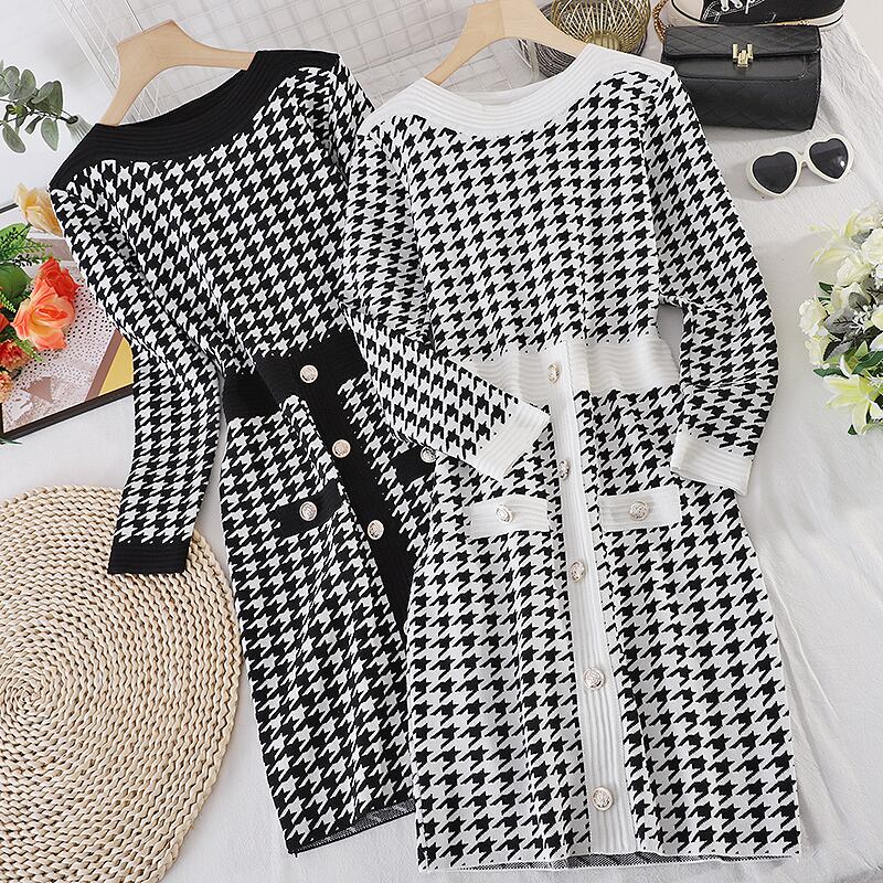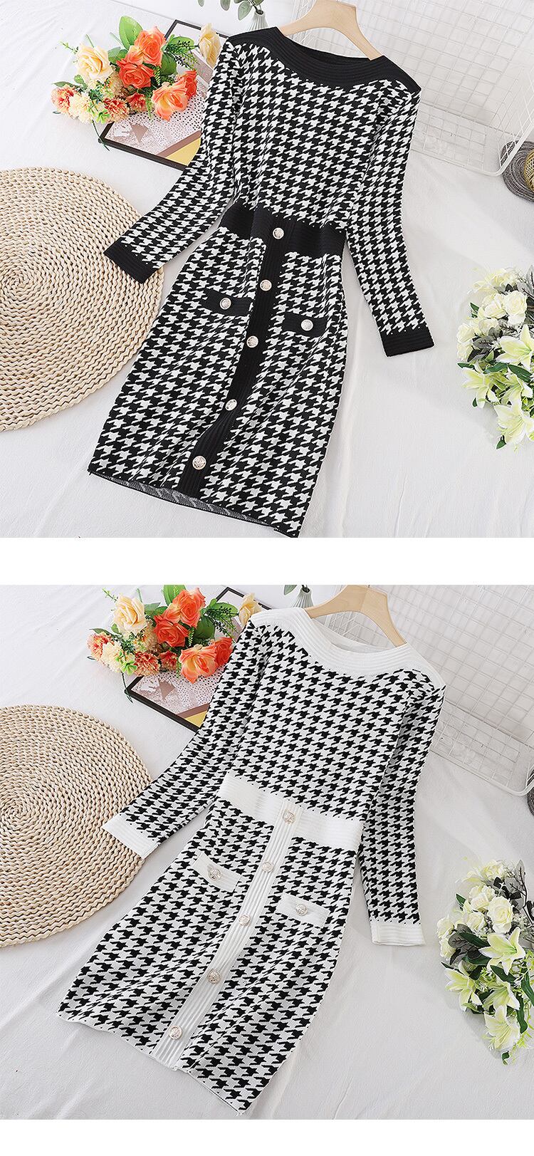 2021年秋冬ニット千鳥格子シックな女性Oネックブラックホワイトチェック柄シルバーボタンボディコン鉛筆スリムドレス オータム 秋物 ウィンター 冬物 銀 Rhc78025979533