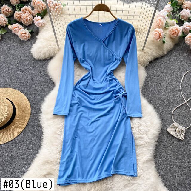 セクシーなスプリットドレスの女性の巾着シャーリング長袖VネックAラインドレス2022春のパーティードレス ロング スプリング 春物 Abe11960852935