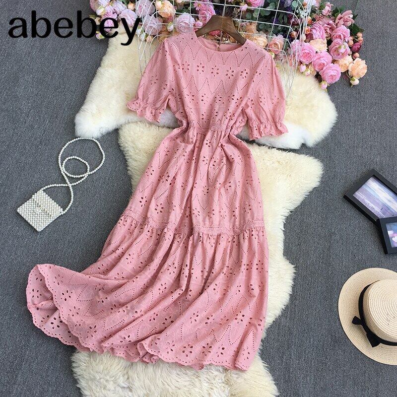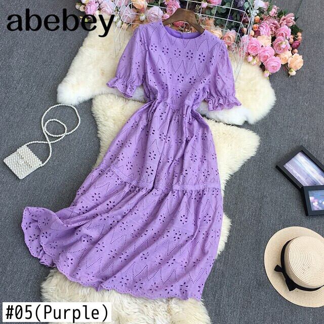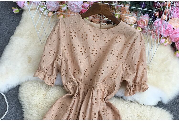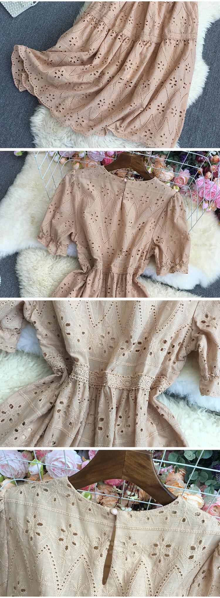 2022年春秋ヴィンテージOネック半袖ドレスフリル中空アウトフックフラワーハイウエストプリーツロングAラインドレス ハイウェスト ショート ハーフスリーブ ラッフル スプリング 春物 オータム 秋物 フラワーデザイン ビンテージ Abe12170946757