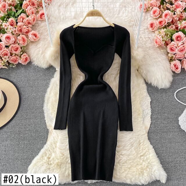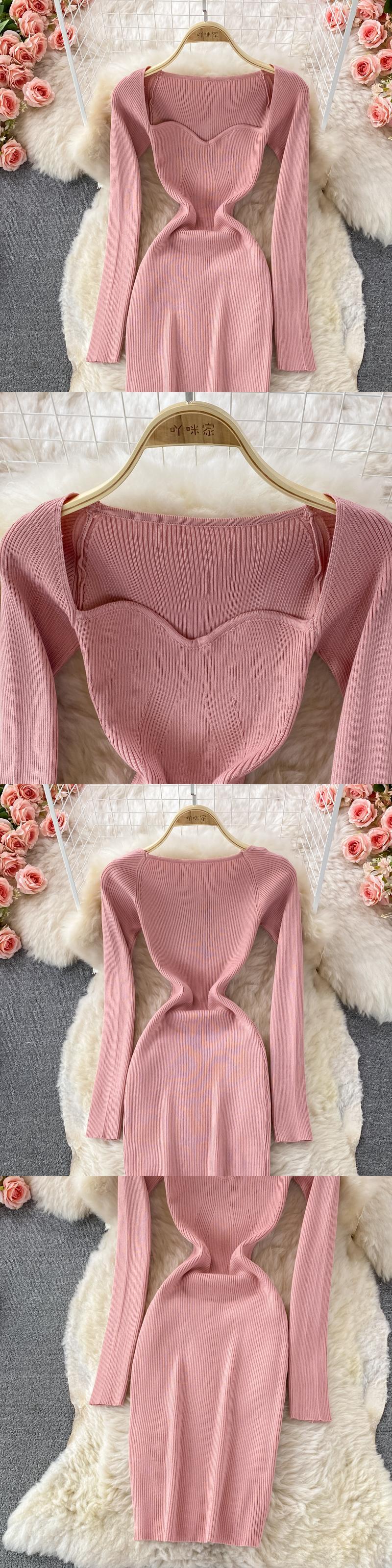 女性秋ニットドレススクエアカラー長袖伸縮性スリムドレス冬シックなボディコンセータードレス ロング エラスティック オータム 秋物 ウィンター 冬物 スクウェア Abe20596498839