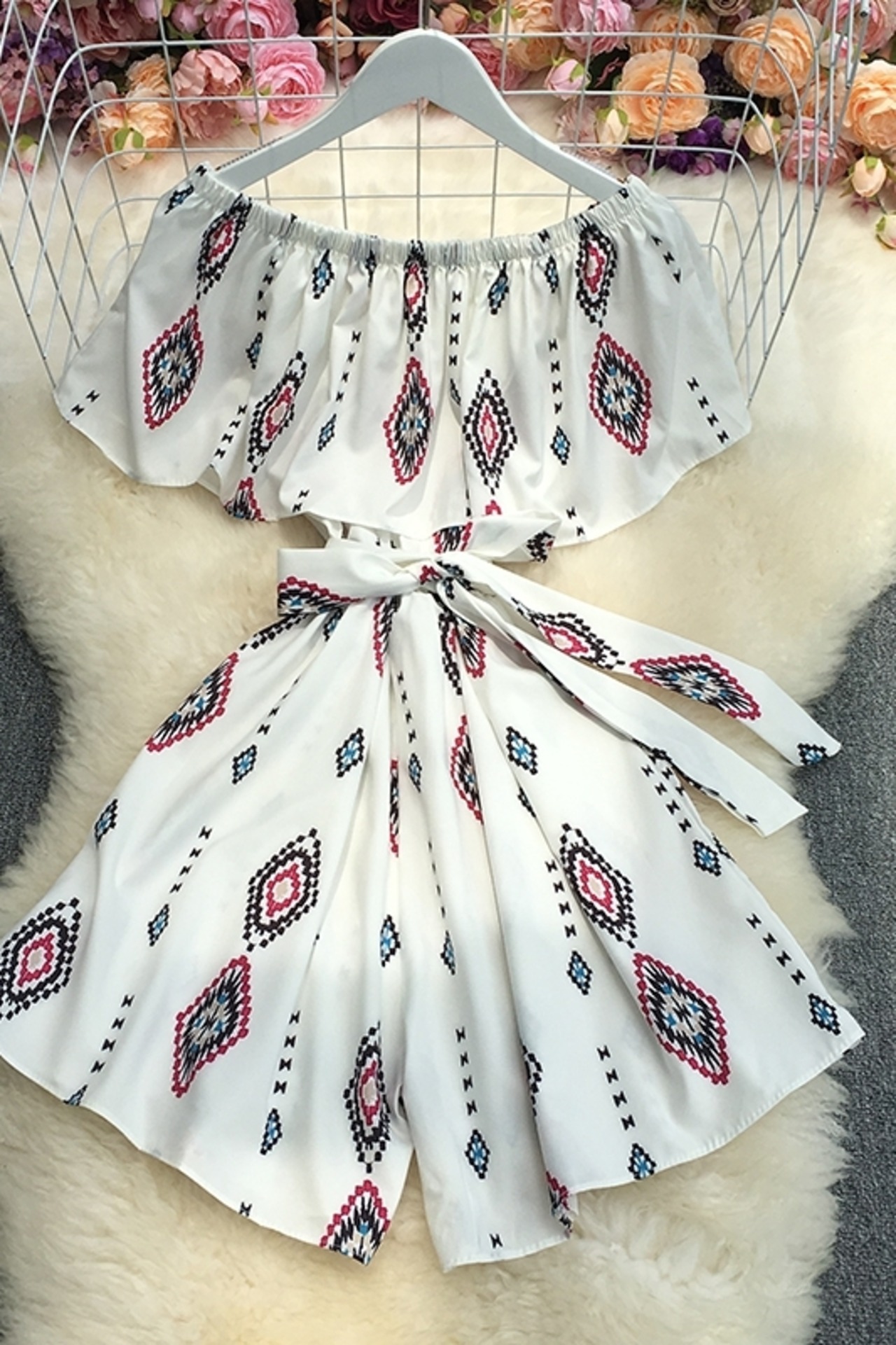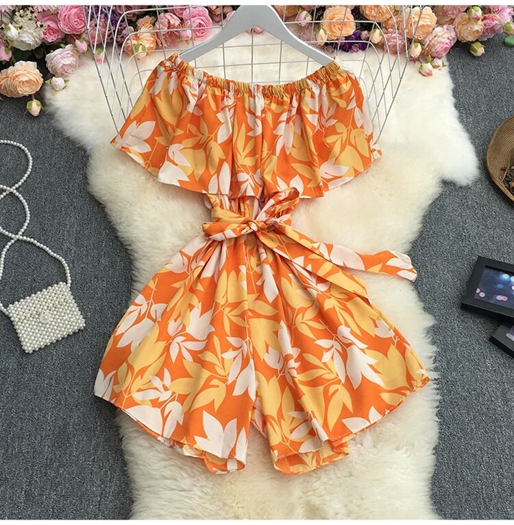 2022年夏のスラッシュネックノースリーブオフショルダーロンパースハイウエストレースアップウエストプリントカジュアルワイドレッグロンパース ハイウェスト サマー 夏物 ワイドパンツ Abe73830090293