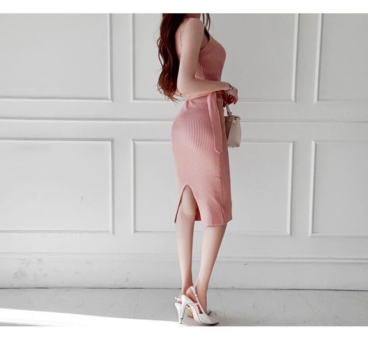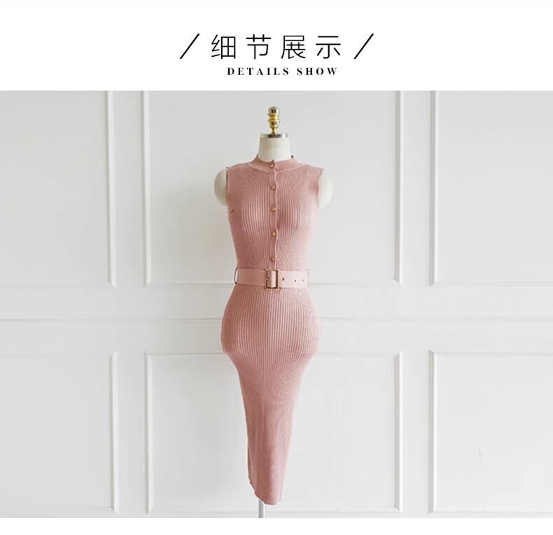 スリムシンプルストレッチニットドレスサマーレディースドレスノースリーブシングルブレストベルトペンシルドレス 夏物 ハーネス Rhc63885657160